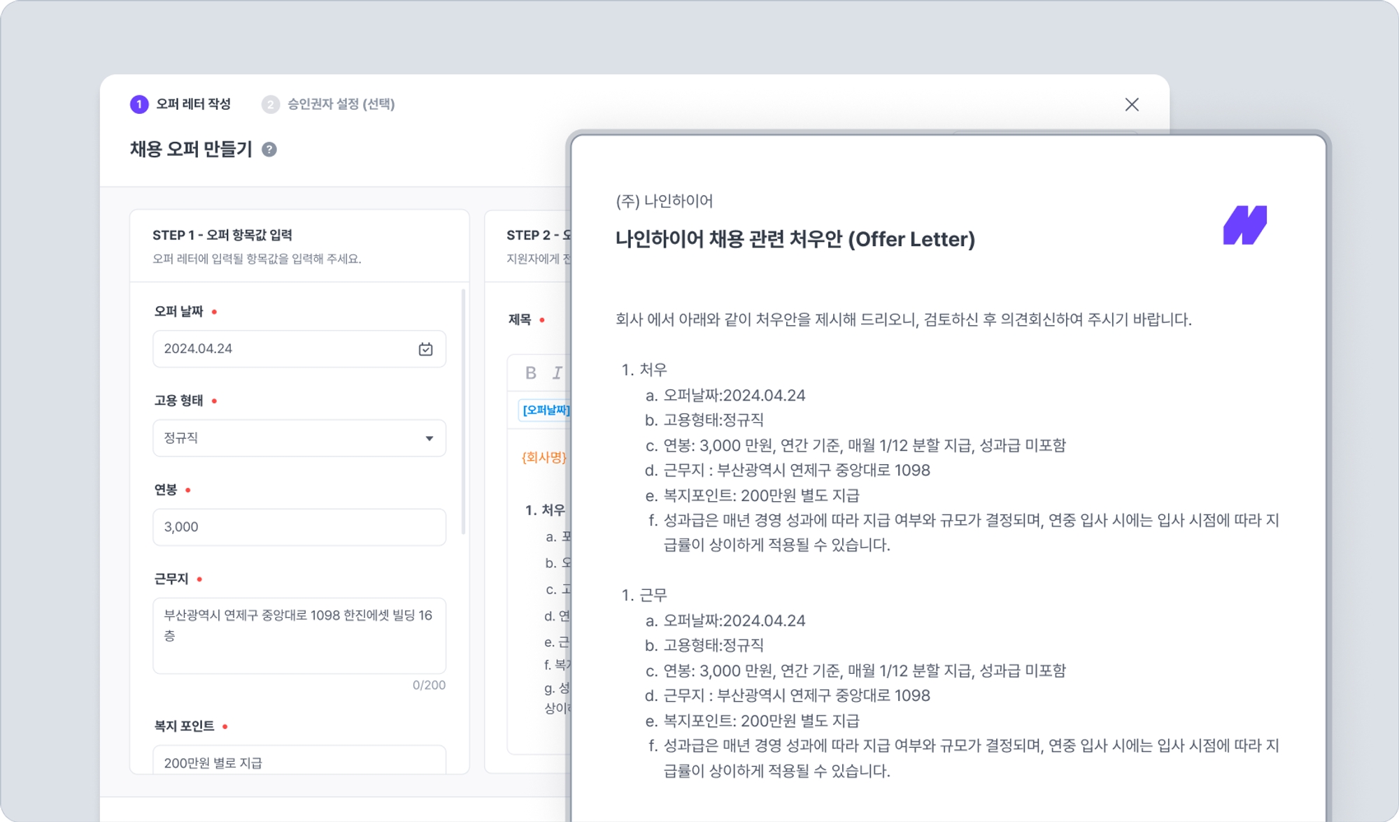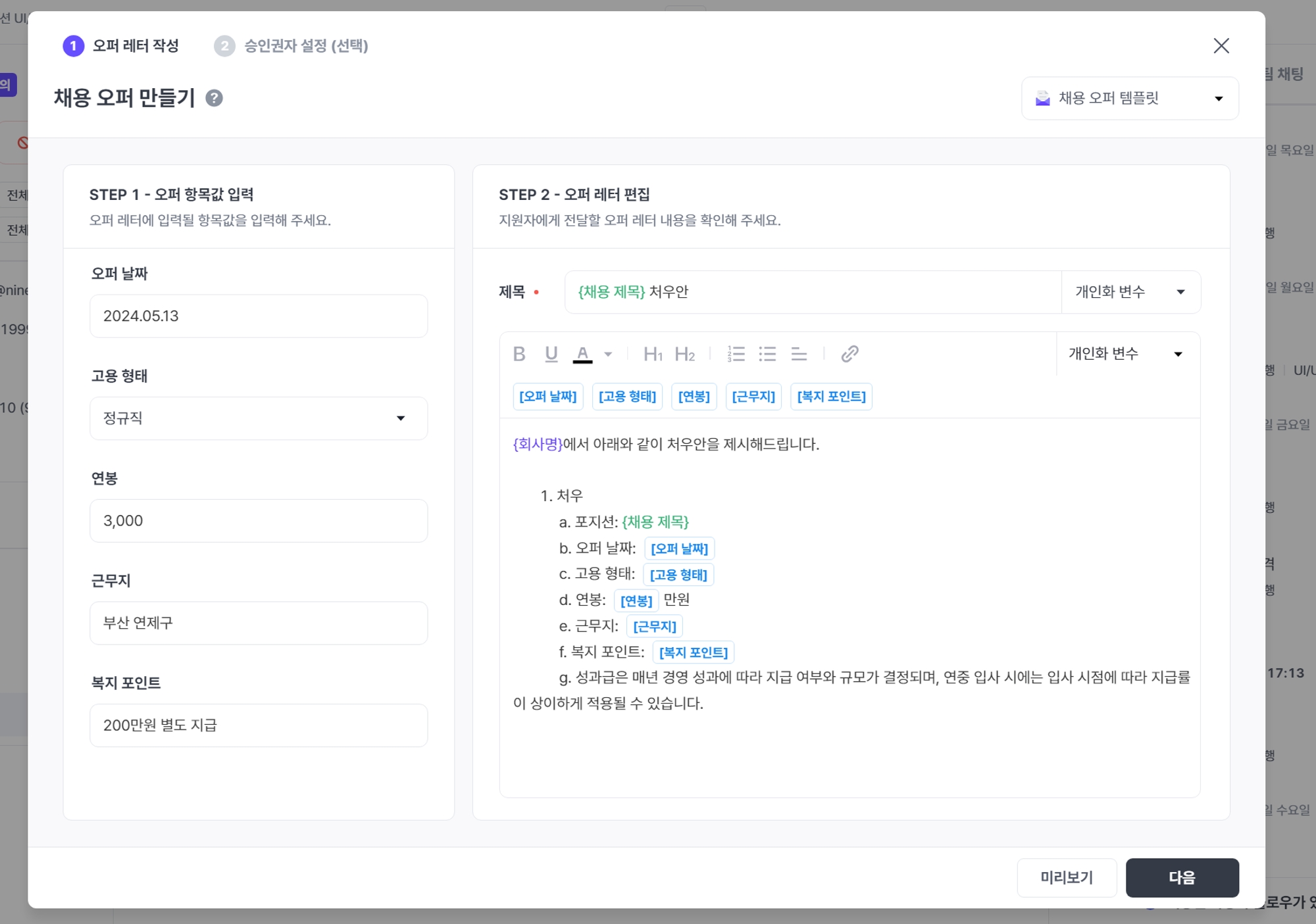 Step 2 - 오퍼 레터 편집: 오퍼 레터의 제목과 Step 1에서 작성한 항목 값을 반영하여 지원자에게 제시할 오퍼 내용을 편집합니다.