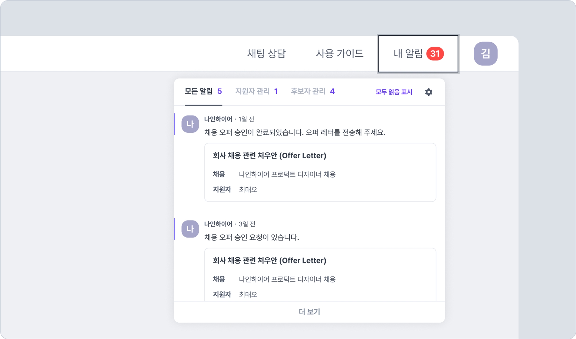 오퍼 레터 승인 요청을 받으면 앱 내 오른쪽 상단에 있는 내 알림에서 알림을 받습니다. 알림을 클릭하여 승인이 필요한 오퍼 레터 내용을 확인할 수 있습니다.