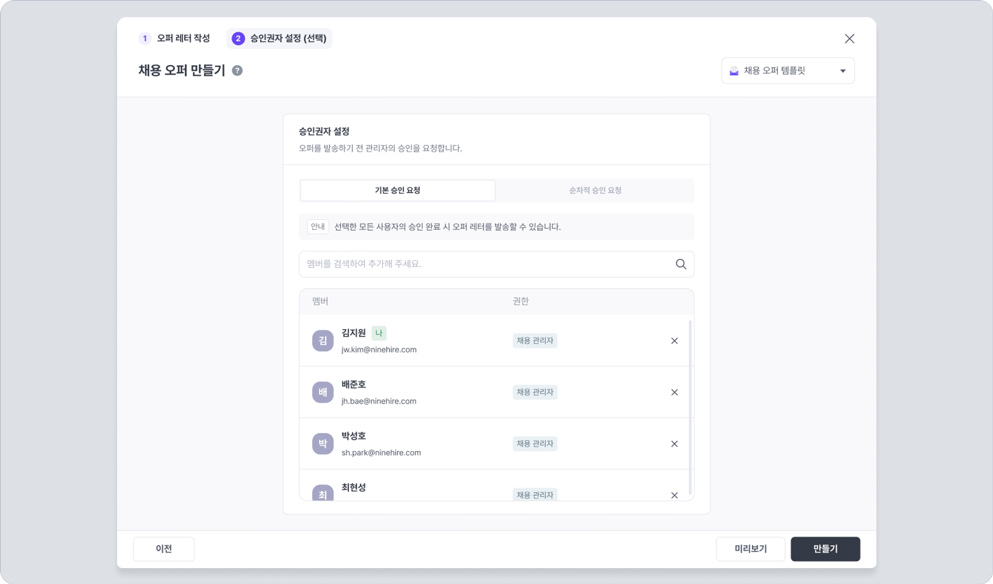 기본 승인 요청: 승인권자로 지정한 모든 담당자에게 한 번에 승인할 수 있습니다. 선택한 모든 사용자의 승인이 완료 되어야 오퍼 레터를 발송할 수 있습니다.