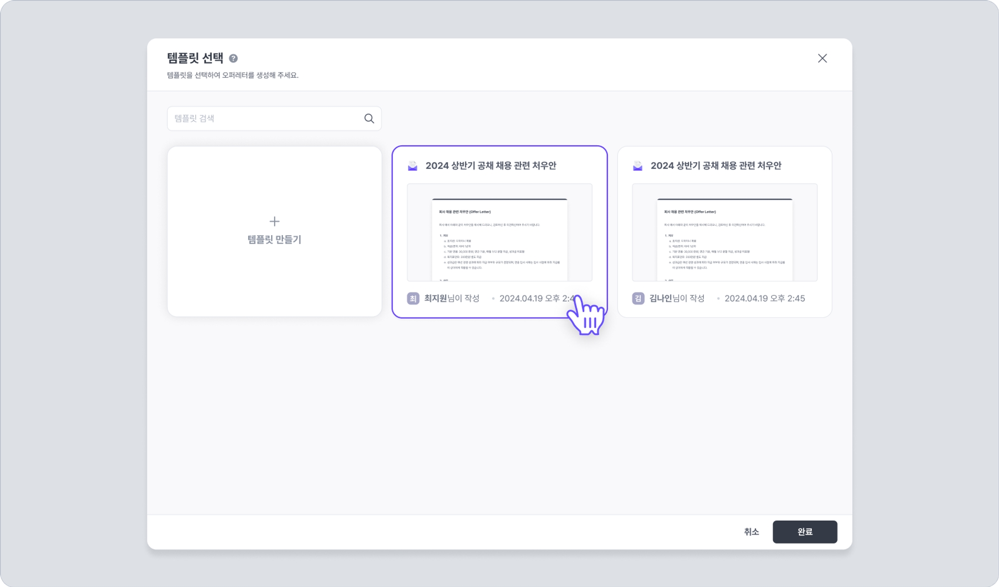 오퍼 레터를 만들기 위해서는 템플릿이 준비되어 있어야 합니다. 미리 생성된 템플릿을 선택하여 오퍼 레터를 불러올 수 있어요.