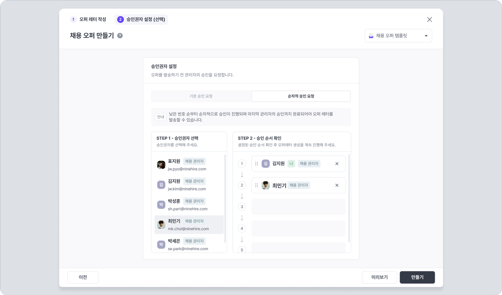 순차적 승인 요청: 지정된 순서에 따라서만 승인할 수 있습니다. 마지막 순서인 관리자의 승인까지 완료되어야 오퍼 레터를 발송할 수 있습니다.