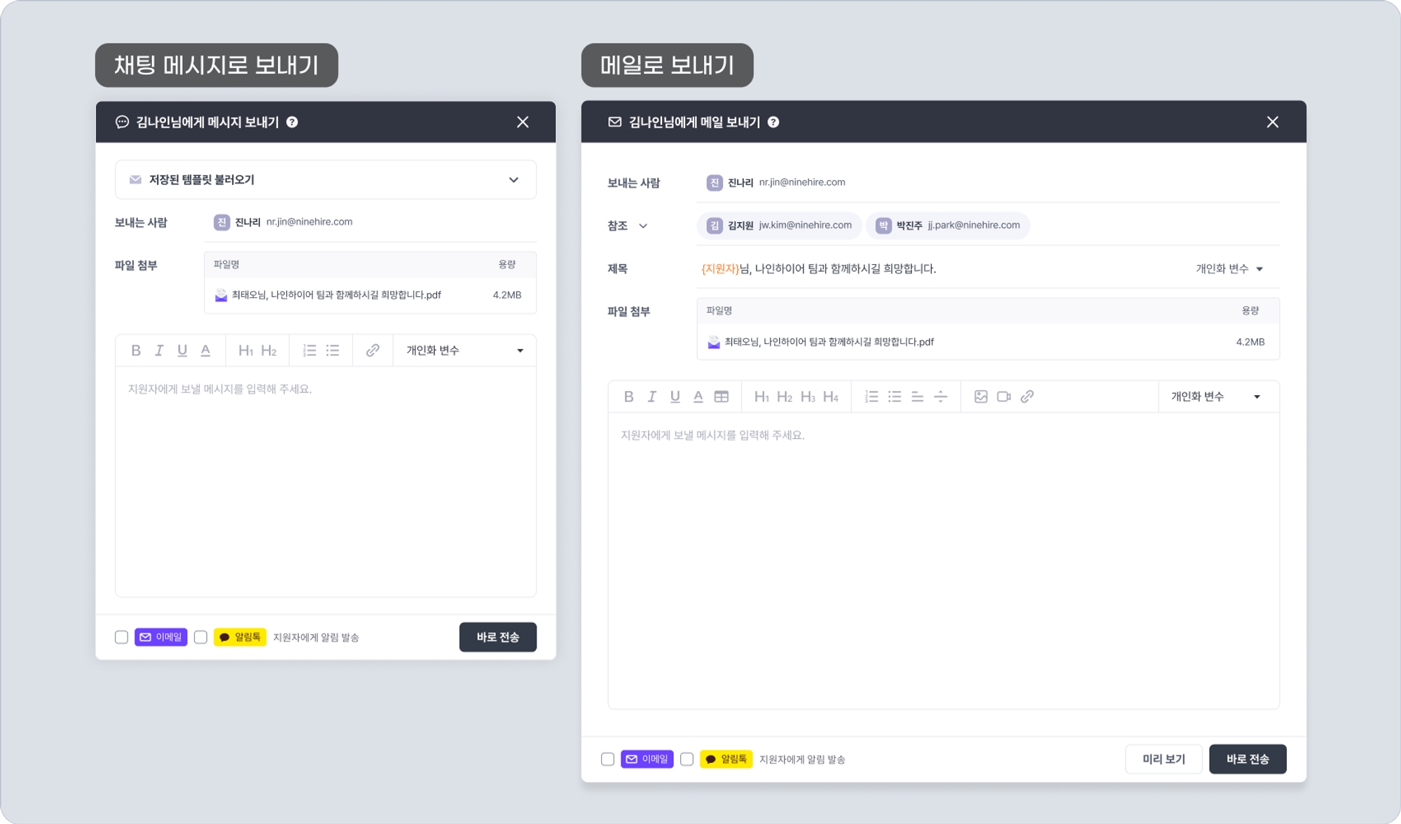 오퍼 레터 전송 방식은 [채팅 메시지로 보내기] 방식과 [메일로 보내기 방식] 중 하나를 선택할 수 있으며, 파일 첨부 항목에 선택한 오퍼 레터가 자동으로 첨부되어 있습니다.