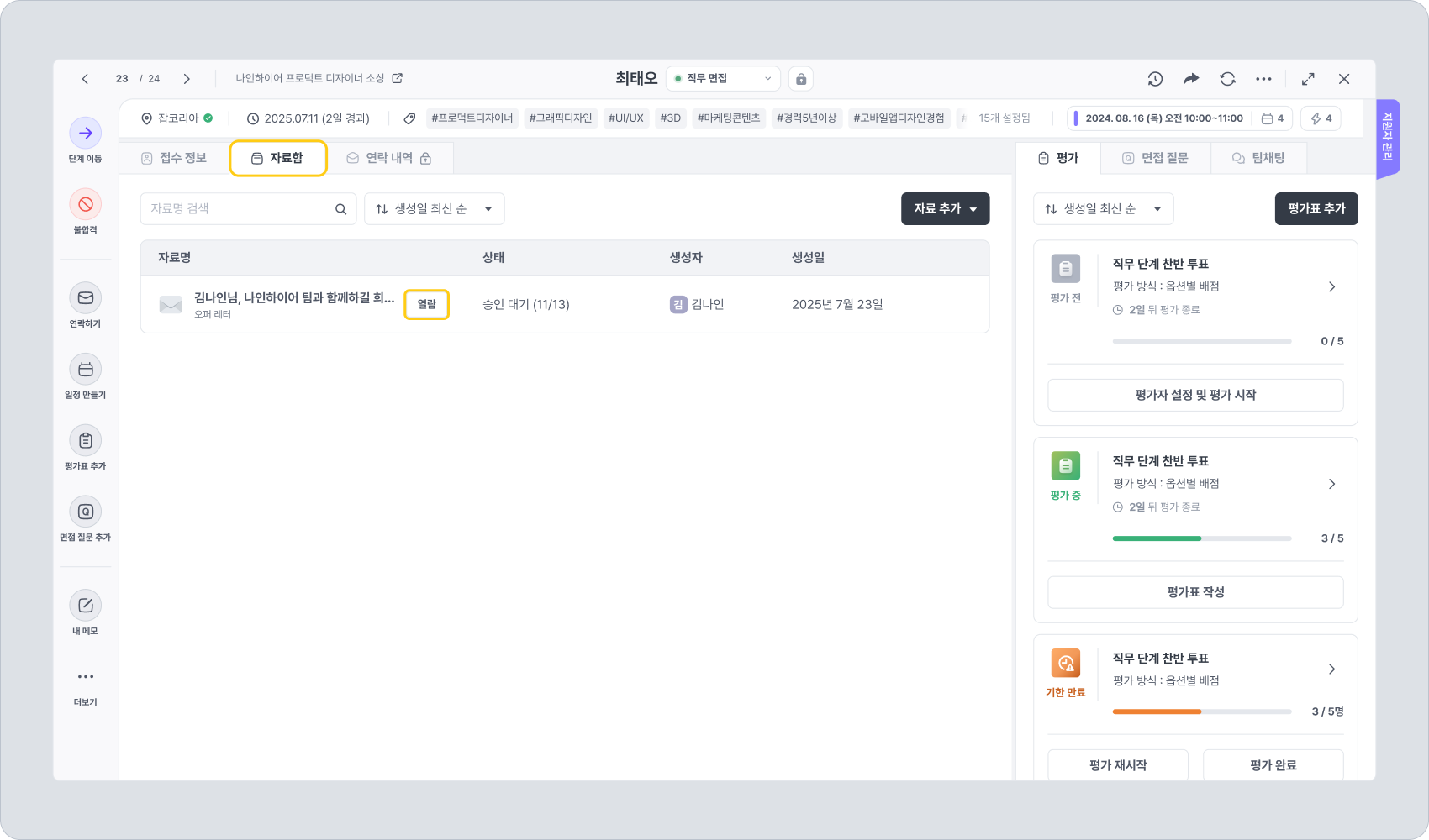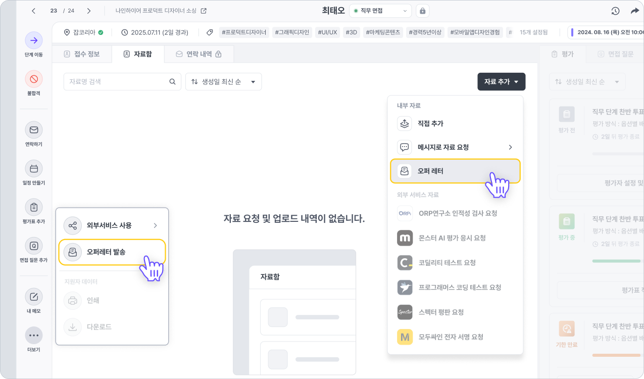 ◼ 경로2: 개별 채용 → 지원자 상세 화면 → 자료함 → 자료 추가 → 오퍼 레터