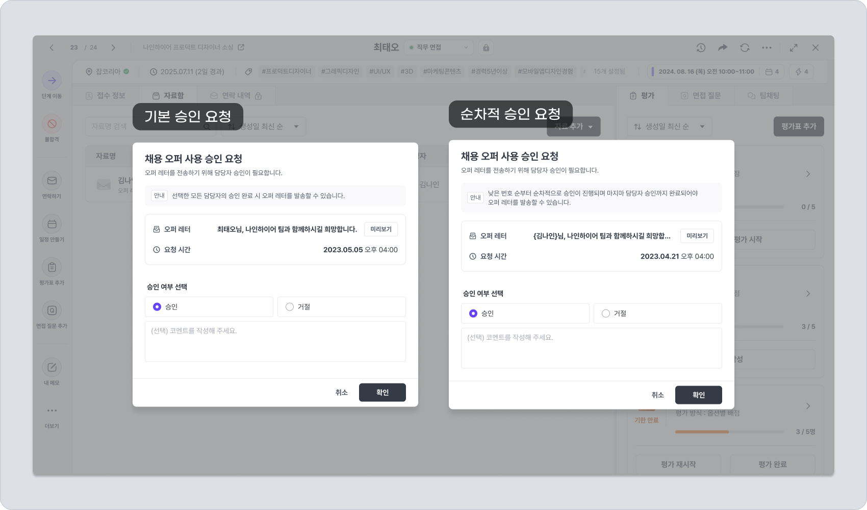 오퍼 레터 사용 승인 요청은 기본 승인 요청 방식과 순차적 승인 요청 방식으로 나뉩니다. 요청 모달이 뜨면 승인 여부를 선택하고 확인 버튼을 클릭합니다.