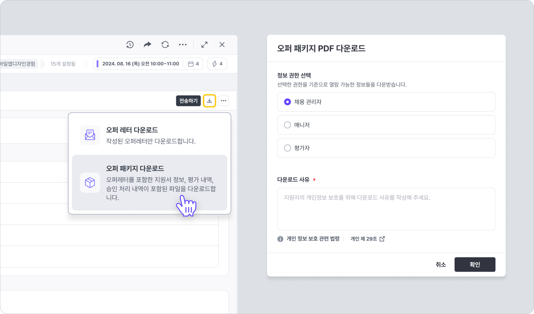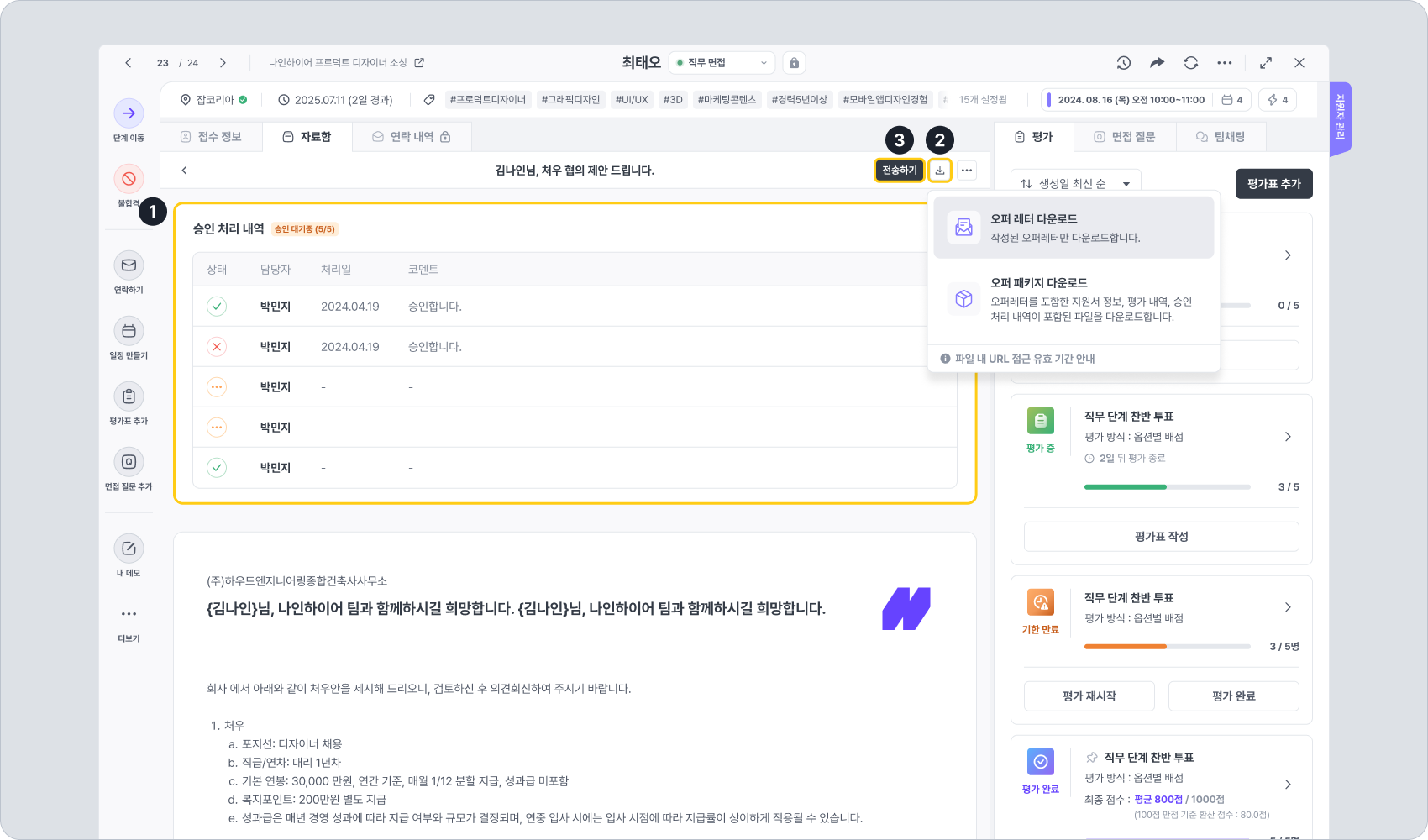 오퍼 패키지 다운로드: 오퍼 레터를 포함한 지원자의 지원서 정보, 평가 내역, 승인 처리 내역을 모두 다운로드 합니다.