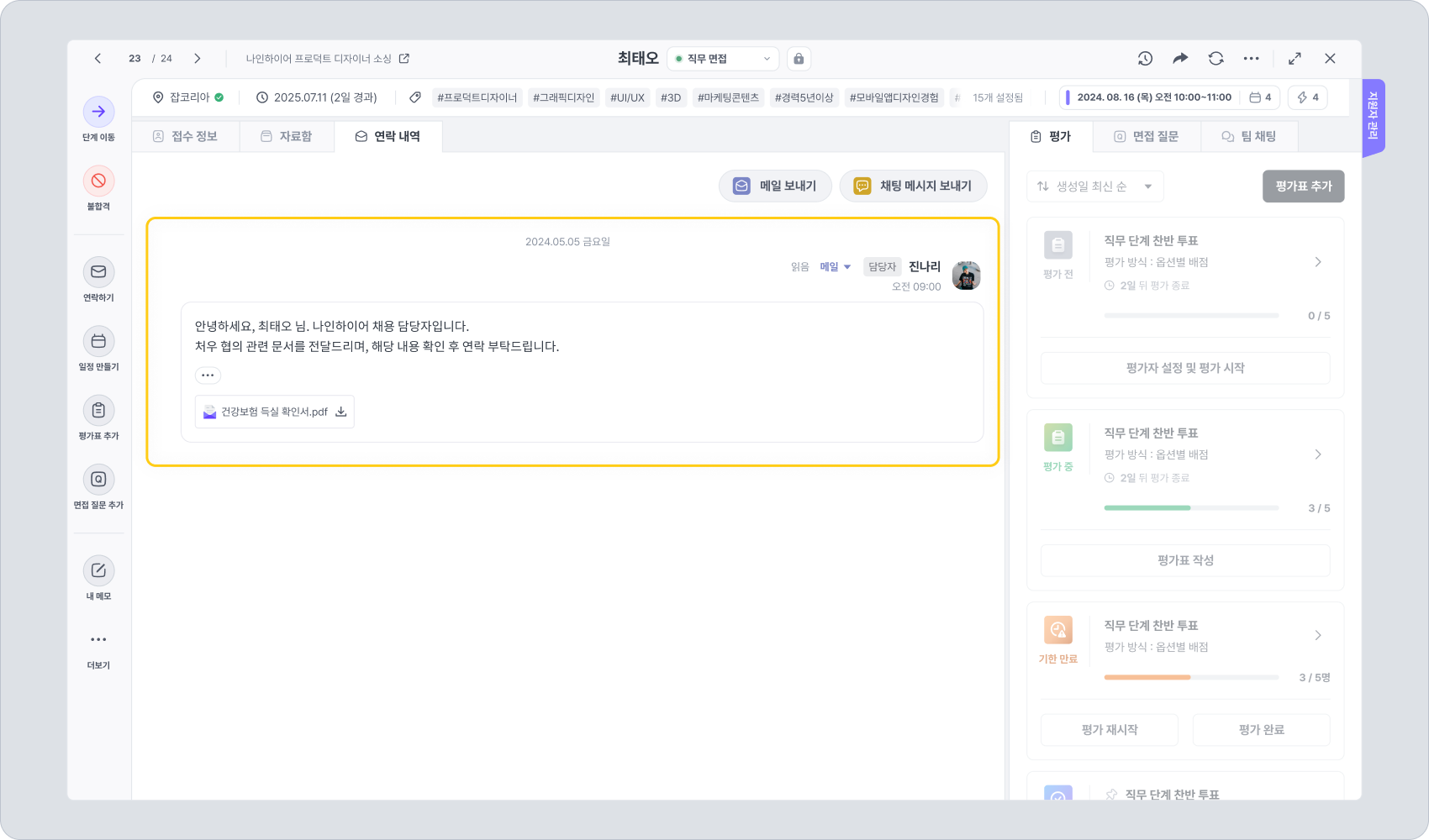 오퍼 레터를 전송한 다음에는 [지원자 연락] 탭에 있는 자료 요청 기능을 활용하여 지원자에게 오퍼 레터에 대한 서명을 요청할 수도 있고, 이를 [요청 자료] 탭에 보관할 수도 있습니다.
