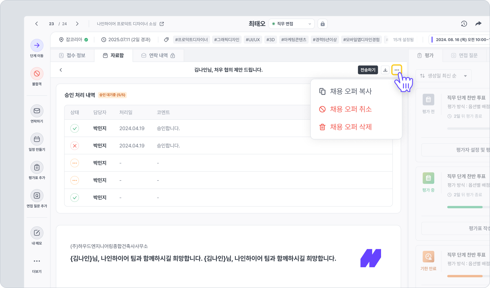 지원자 상세 화면의 간편 액션바와 자료함, 두 개의 경로에서 오퍼 레터 작성이 가능합니다.