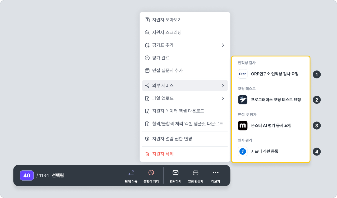나인하이어에서 연동 및 사용을 지원하고 있는 외부서비스 중 지원자 다중 선택 후 액션으로 활용할 수 있는 서비스 리스트입니다.