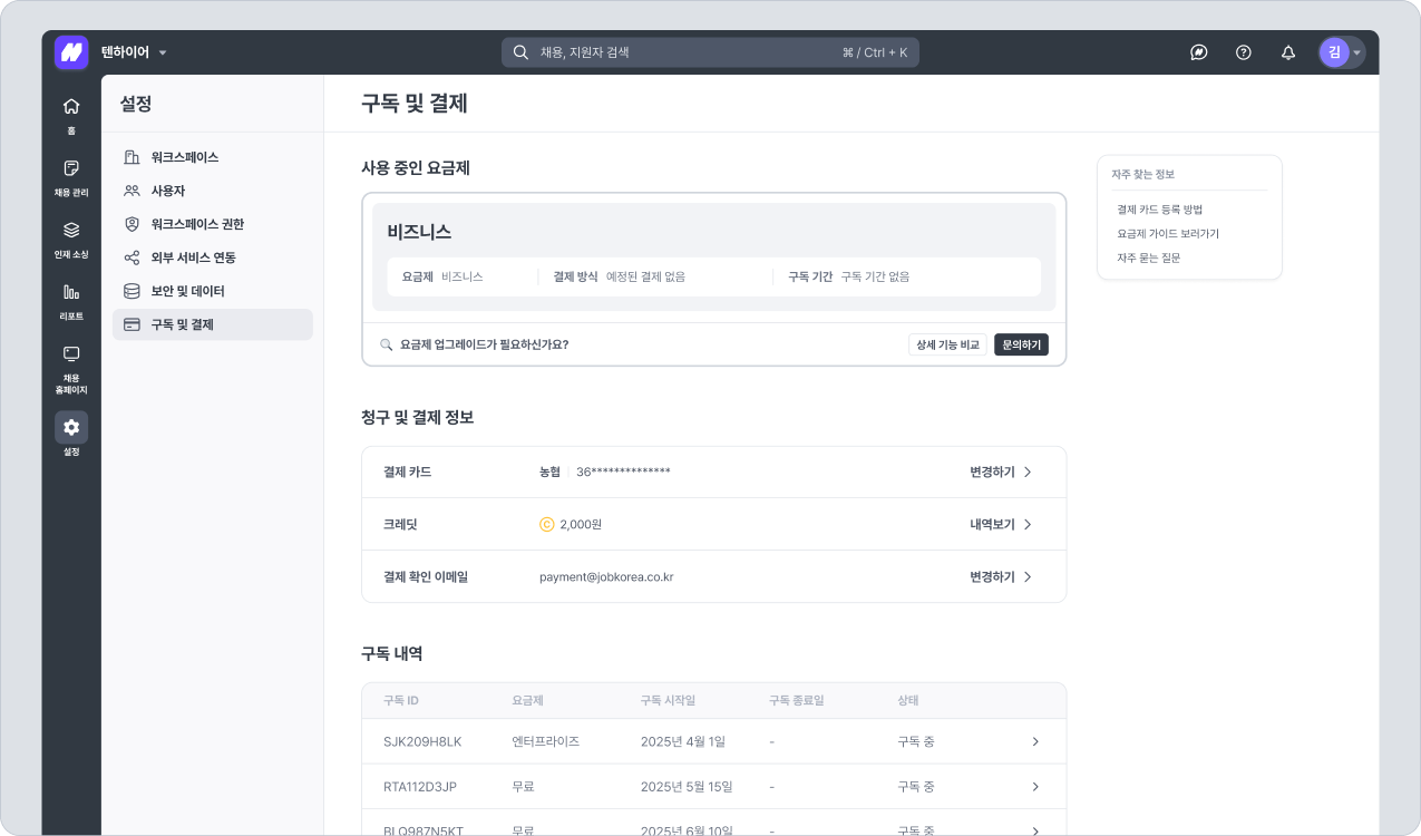 워크스페이스의 설정 > 구독 및 결제 페이지에서 요금제 확인, 구독 및 변경이 가능합니다. 이 페이지에서는 요금제 확인, 요금제 변경, 청구 주기 확인, 정기 결제 해지 등에 대한 안내를 제공합니다.