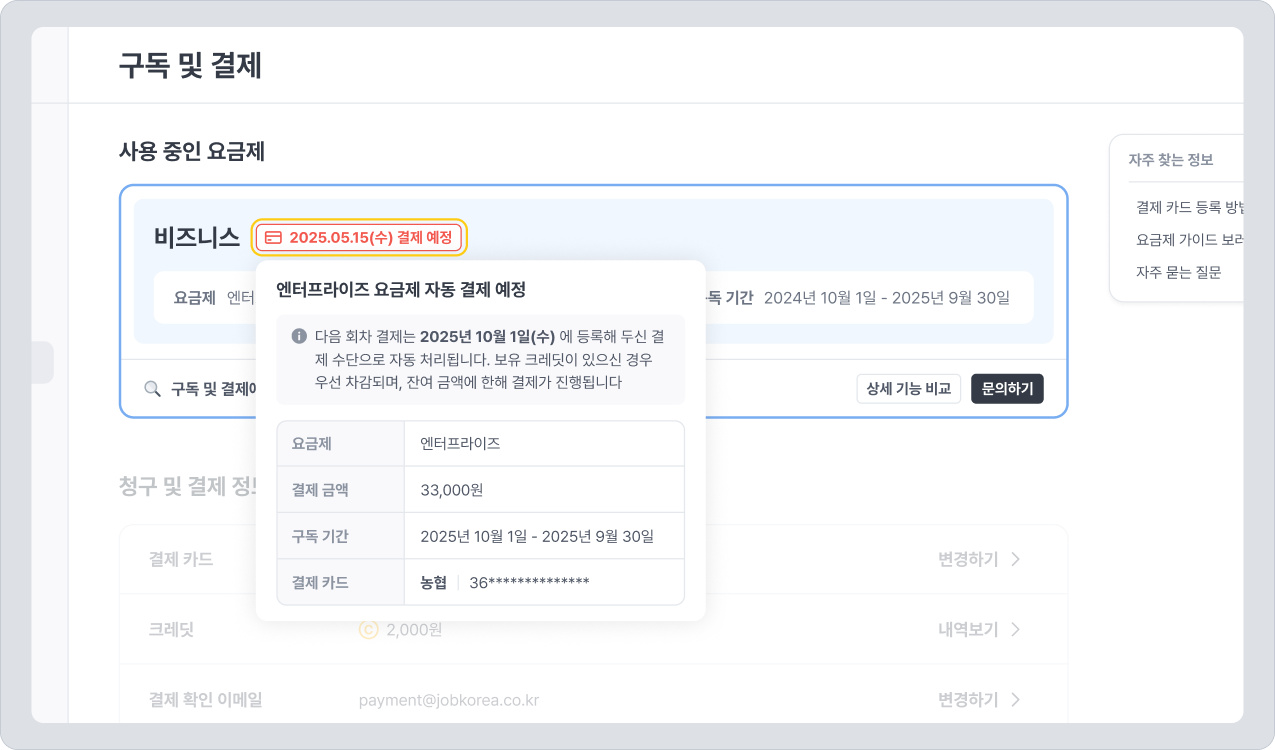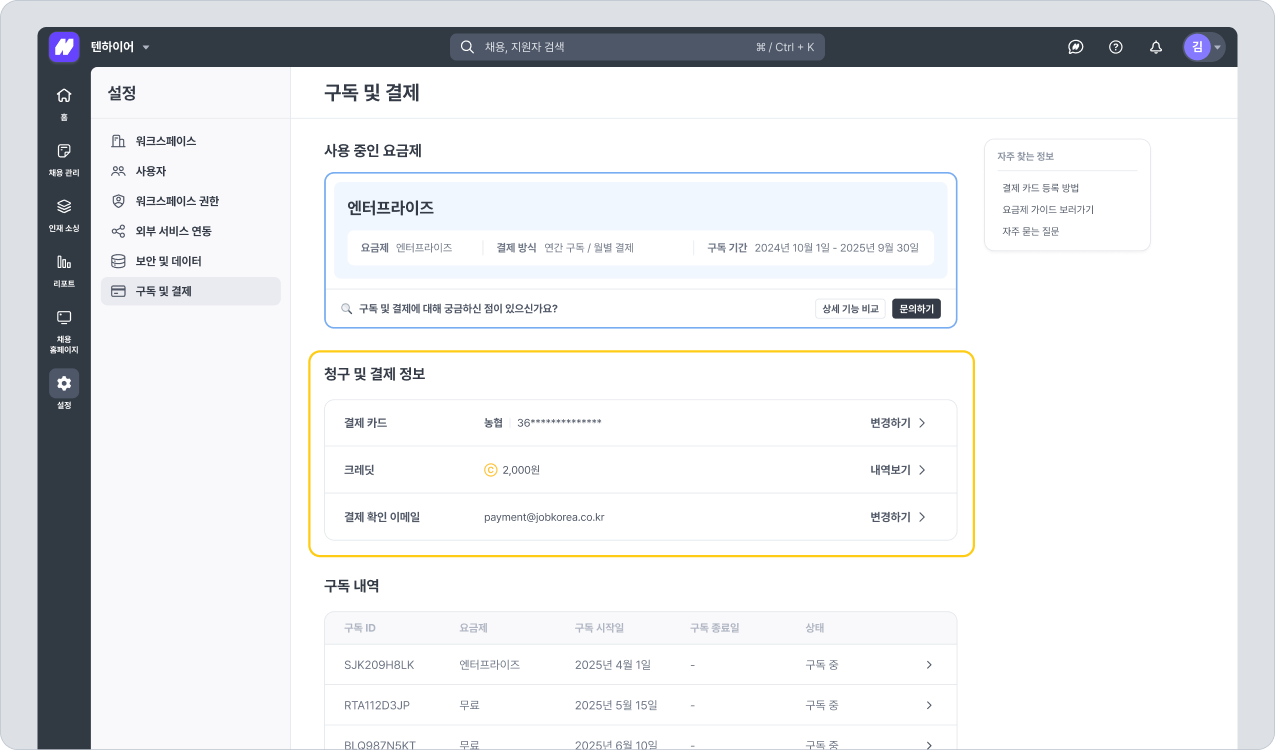 엔터프라이즈(유료) 요금제를 구독하는 경우, “청구 및 결제 정보”에서 구독 및 결제 정보를 등록할 수 있어요. 결제 카드, 결제 확인을 받기 위한 이메일 등의 정보를 등록하고, 확인합니다.