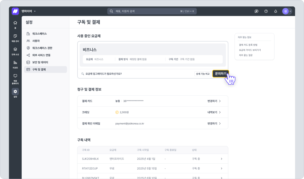 엔터프라이즈 영역에 있는 [나인하이어 팀에게 문의하기] 버튼을 클릭하여 구독 및 결제 관련 상담을 받을 수 있습니다.