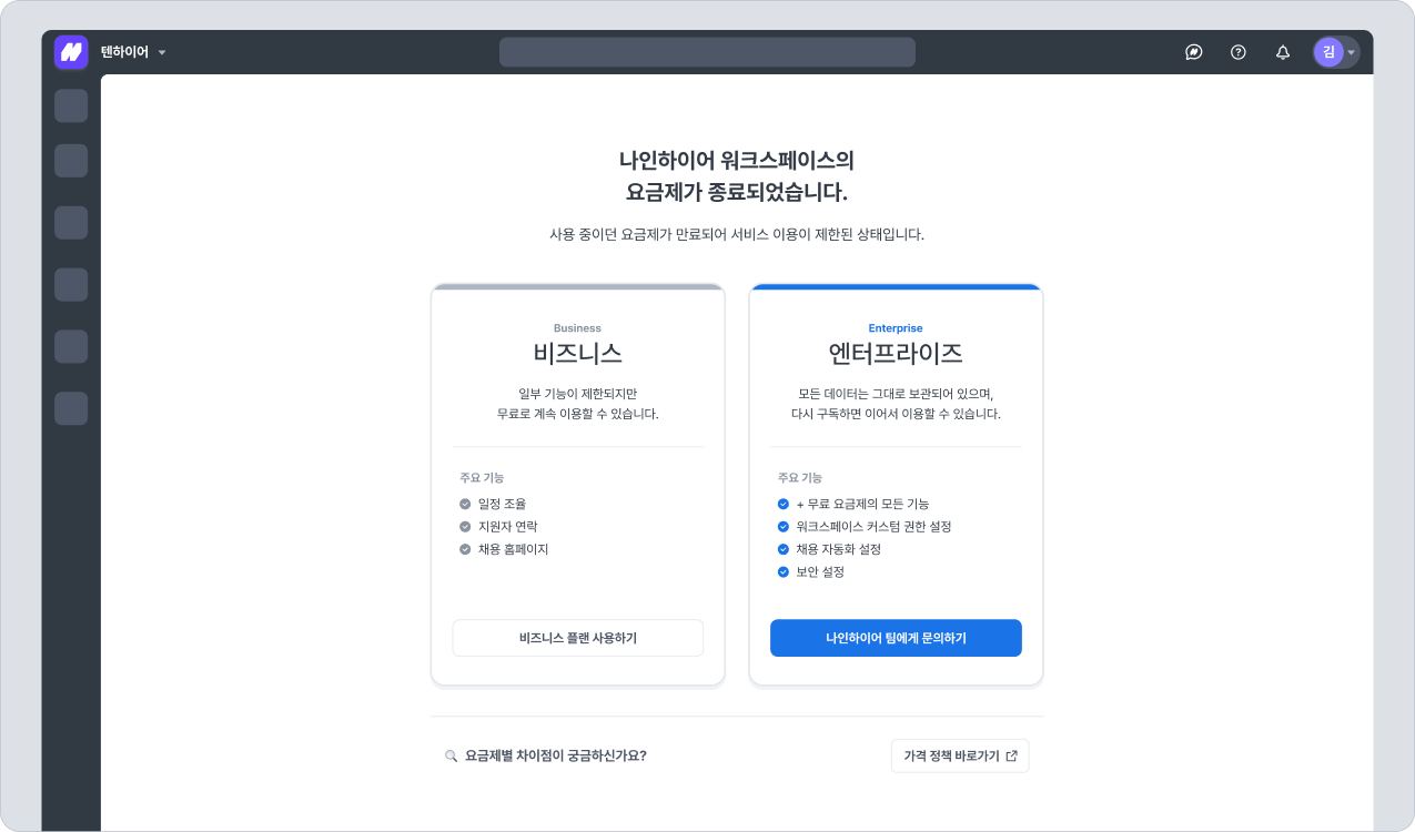 엔터프라이즈(유료) 요금제가 만료되면 서비스 이용이 제한됩니다. 워크스페이스를 다시 이용하고 싶다면 비즈니스 혹은 엔터프라이즈 요금제 중 하나를 선택해 주세요.
