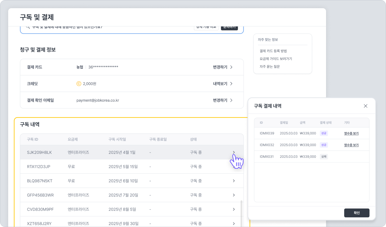 “구독 내역”에서는 구독 ID를 포함하여 요금제, 구독 시작일과 종료일, 구독 상태, 결제 내역 등의 히스토리를 확인할 수 있어요.