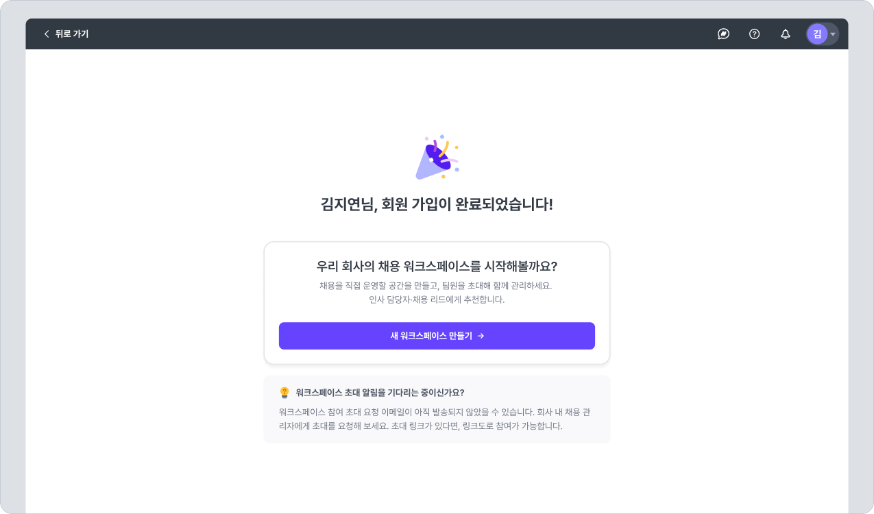 우리 회사에서 사용하고 있는 워크스페이스가 이미 있다면, 워크스페이스의 관리자로부터 초대를 받고, 수락하여 사용 중인 워크스페이스에 합류하세요.