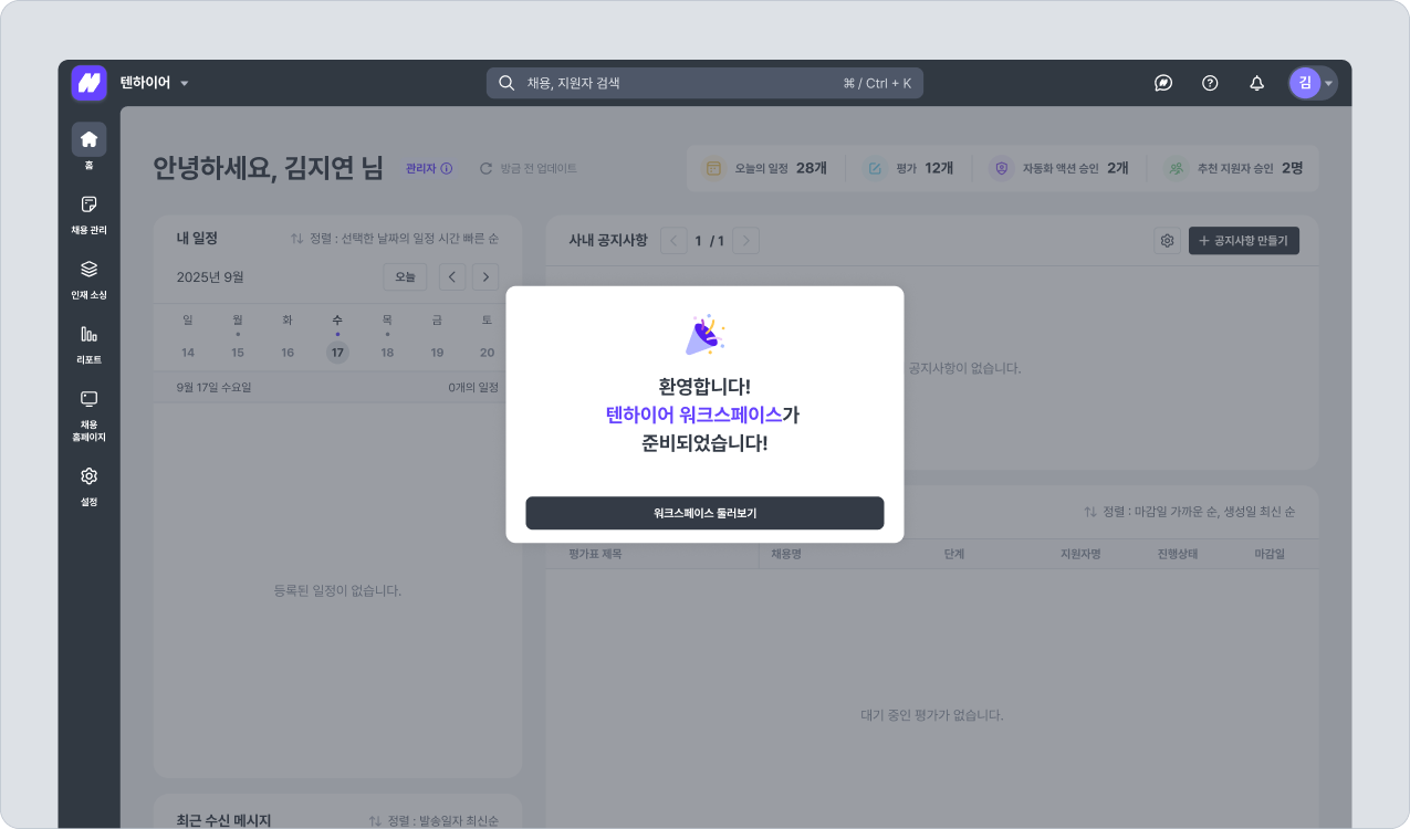 새로운 워크스페이스가 생성되면 홈 화면이 표시됩니다.