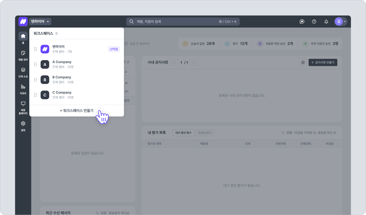 새 워크스페이스의 이름 설정 및 정보를 입력합니다. 이 이름은 지원자와 내부 구성원에게 노출되며 워크스페이스를 만든 후 언제든 수정할 수 있습니다.