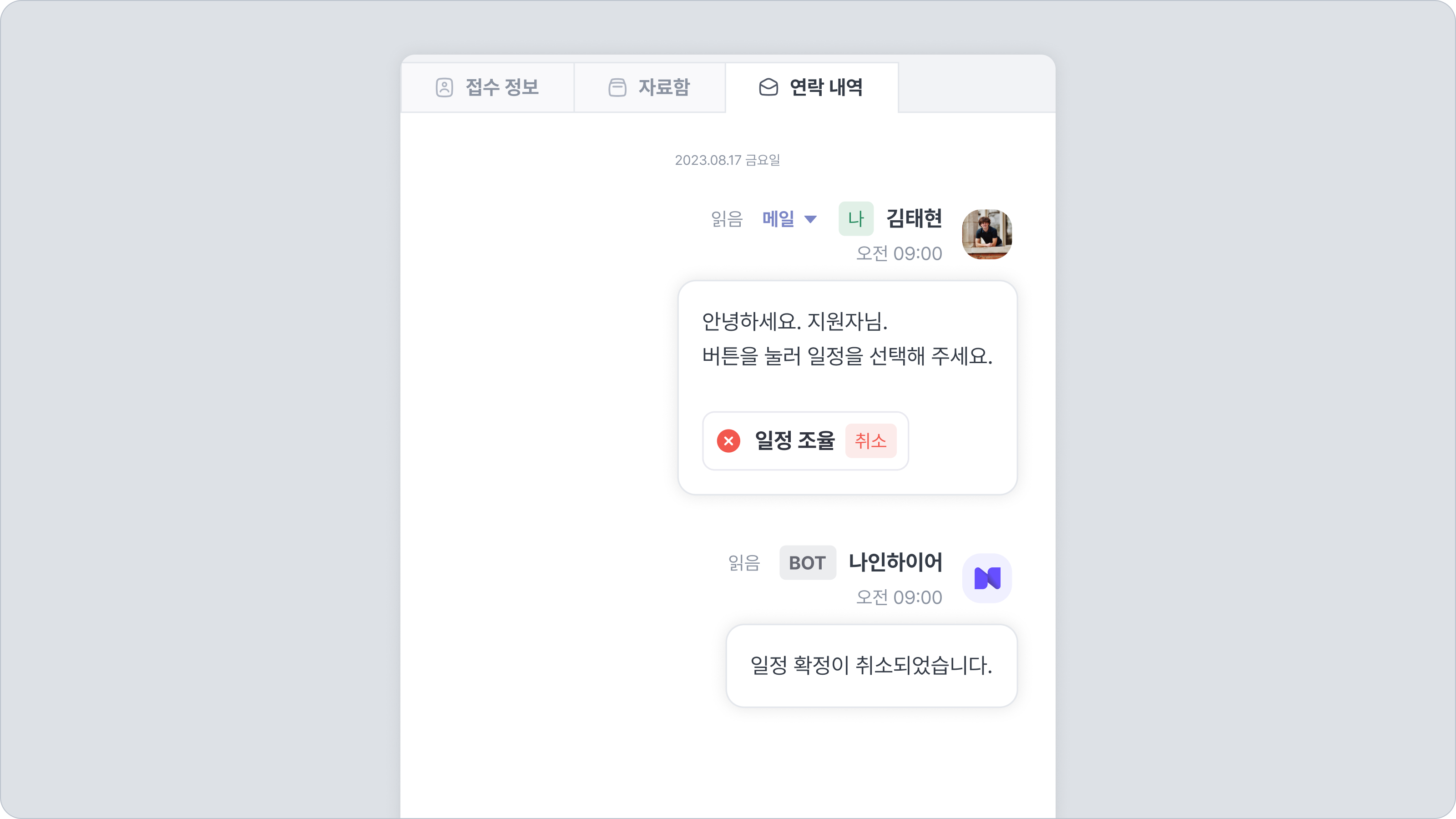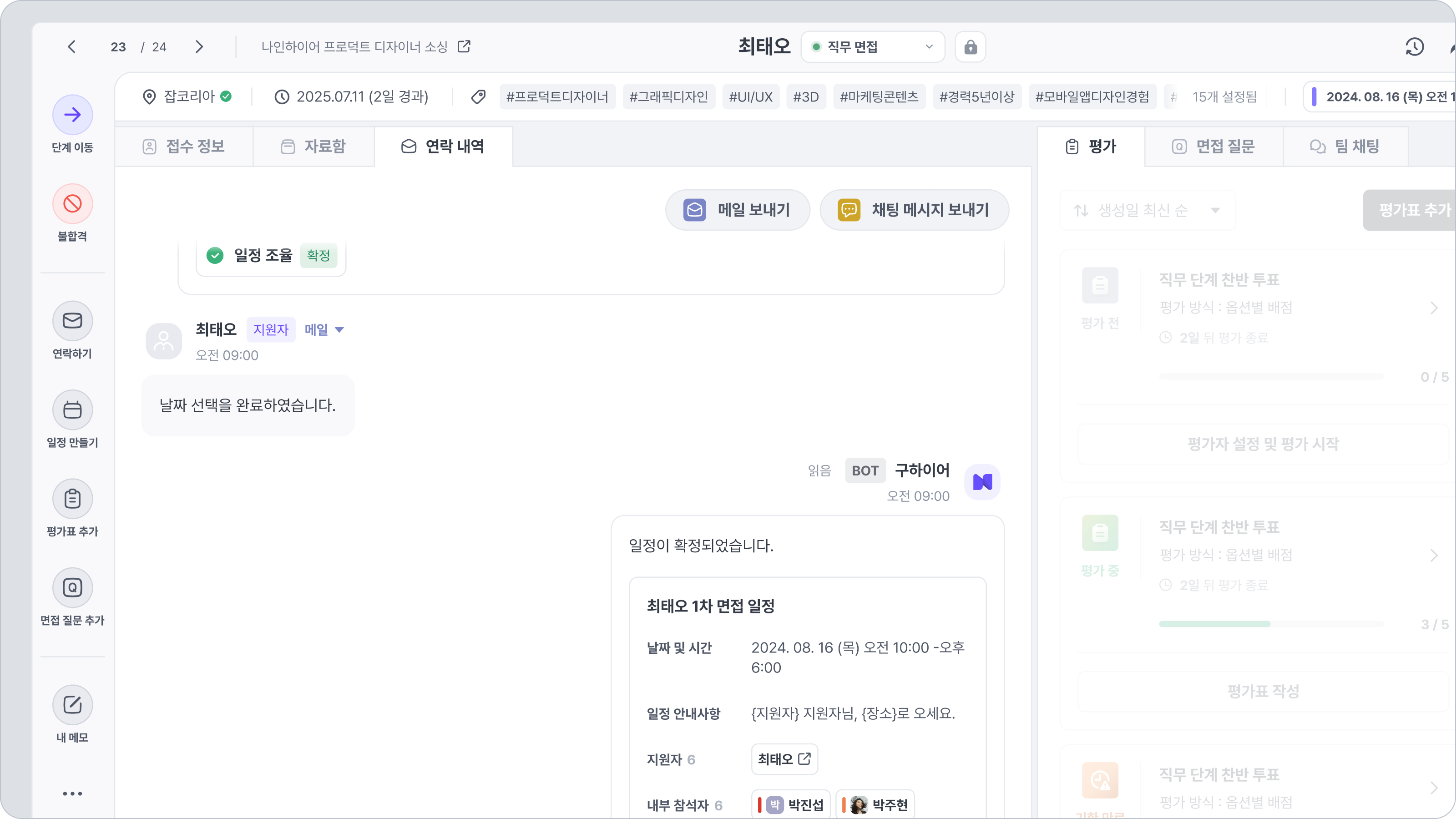지원자에게 일정 조율 메일/메시지를 보내면, 연락 내역 탭에서는 일정 조율 상태가 표시됩니다.