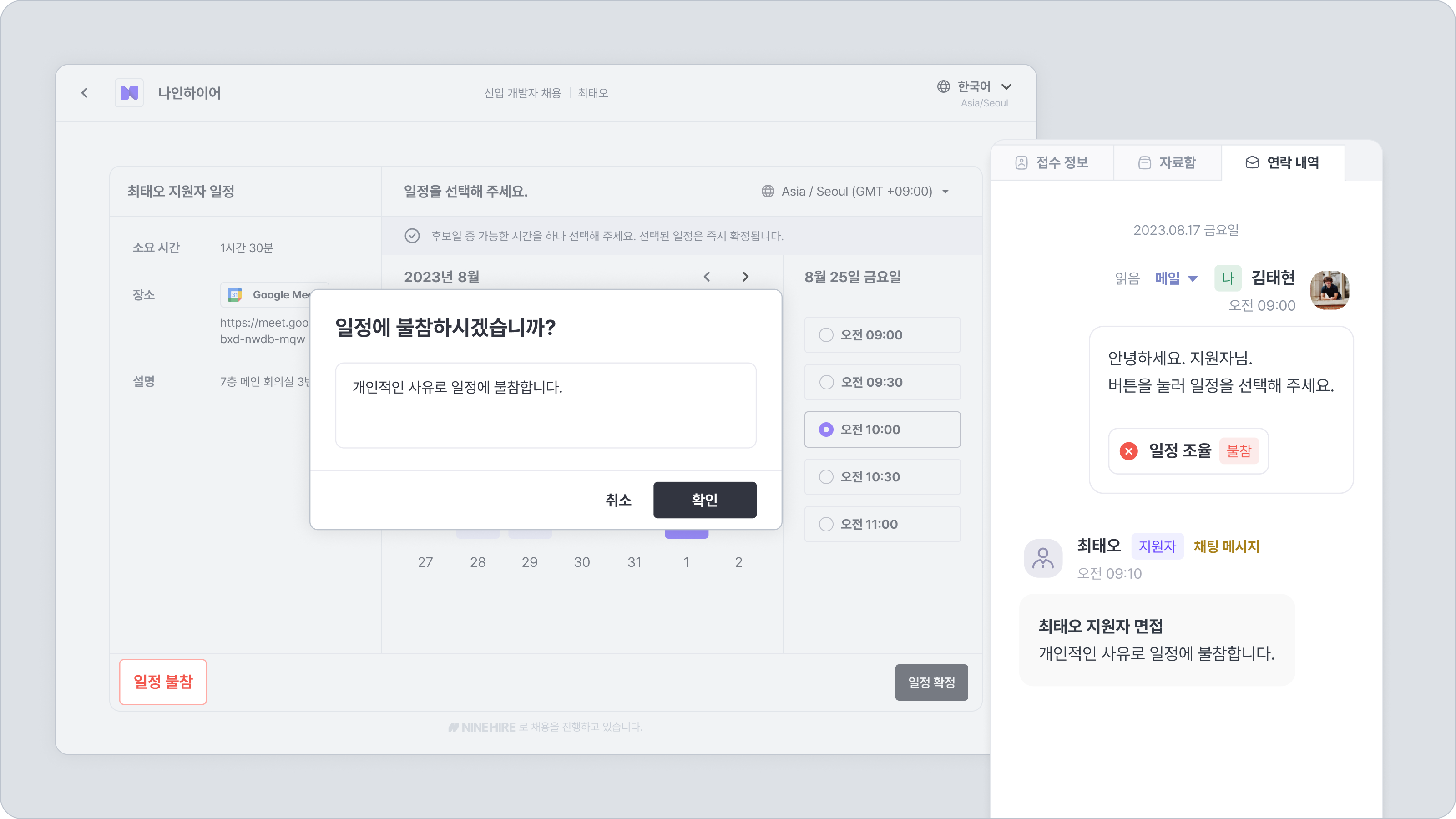 지원자가 불참 버튼을 클릭하면, 해당 일정에 대한 불참 의사를 표시하게 됩니다. 그리고, 지원자 연락 탭 내에서 일정 조율 버튼의 상태가 "불참"으로 표시됩니다.
