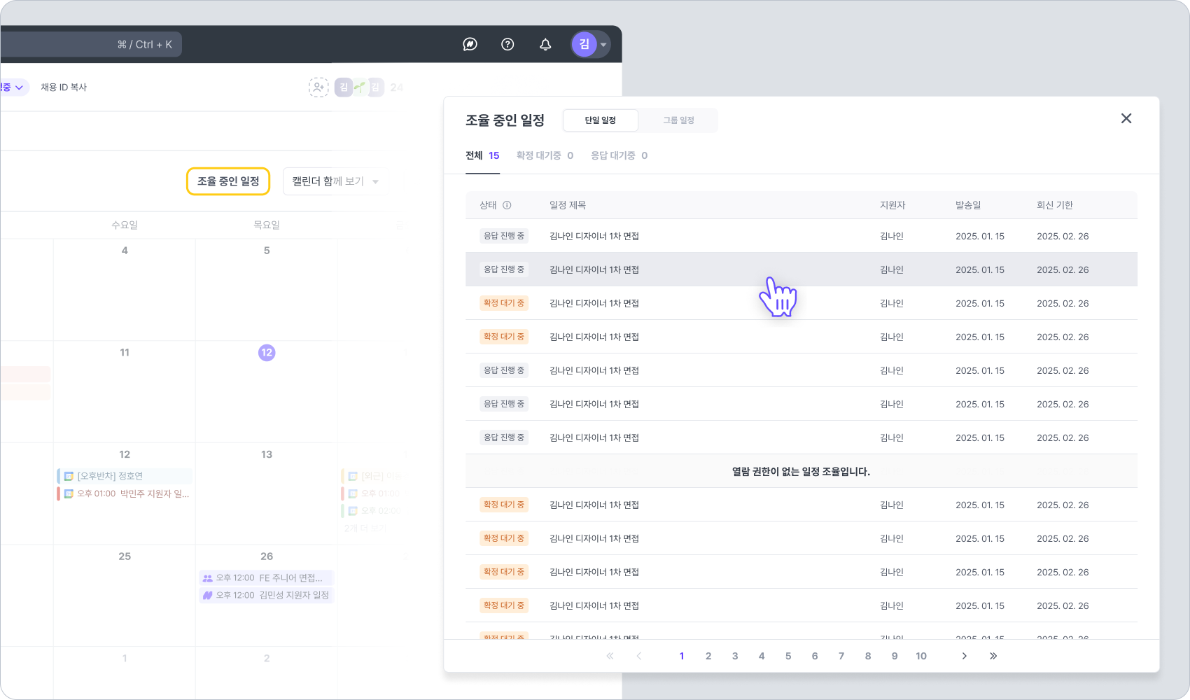 전체 캘린더 탭 > 조율 중인 일정 버튼 클릭 시
