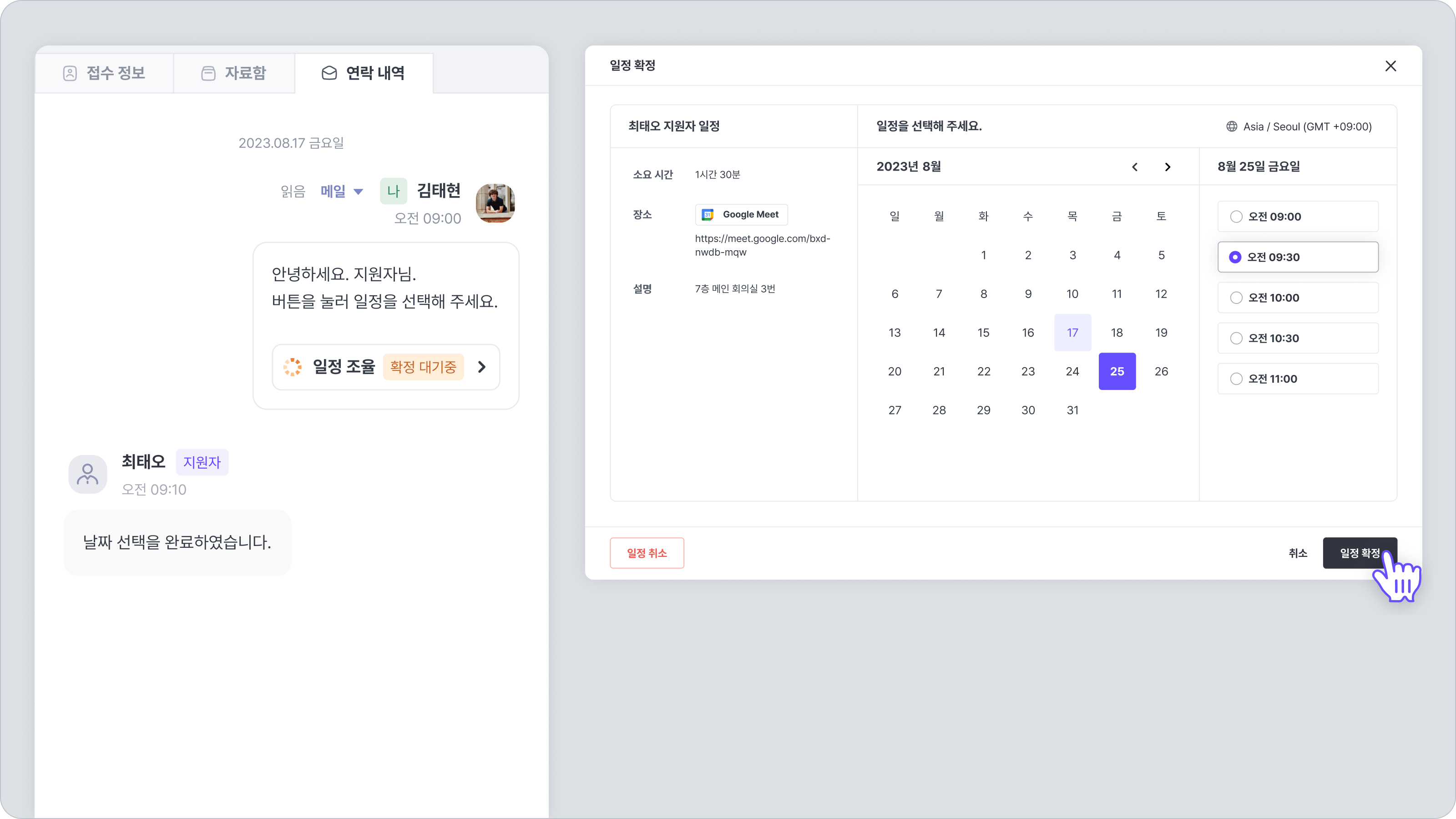 "선택 전", "확정 대기 중"과 같은 버튼을 클릭하면 담당자 입장에서 해당 일정을 확정하거나 조율 취소할 수 있는 모달이 나타납니다.