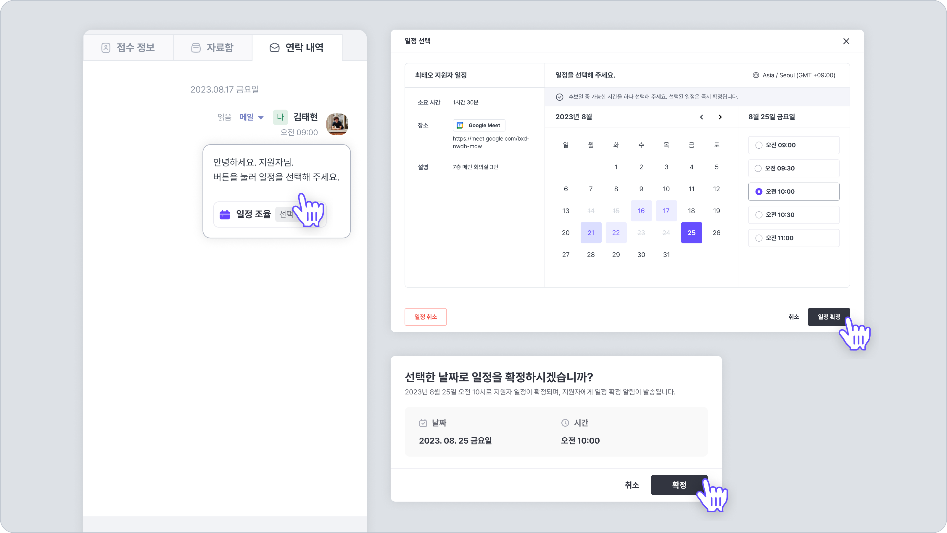 일정 조율 설정 과정에서 일정 확정 방법을 “지원자가 직접 일정 확정” 방법으로 설정한 경우, 지원자가 일정을 선택하면 선택한 일정으로 바로 확정됩니다.