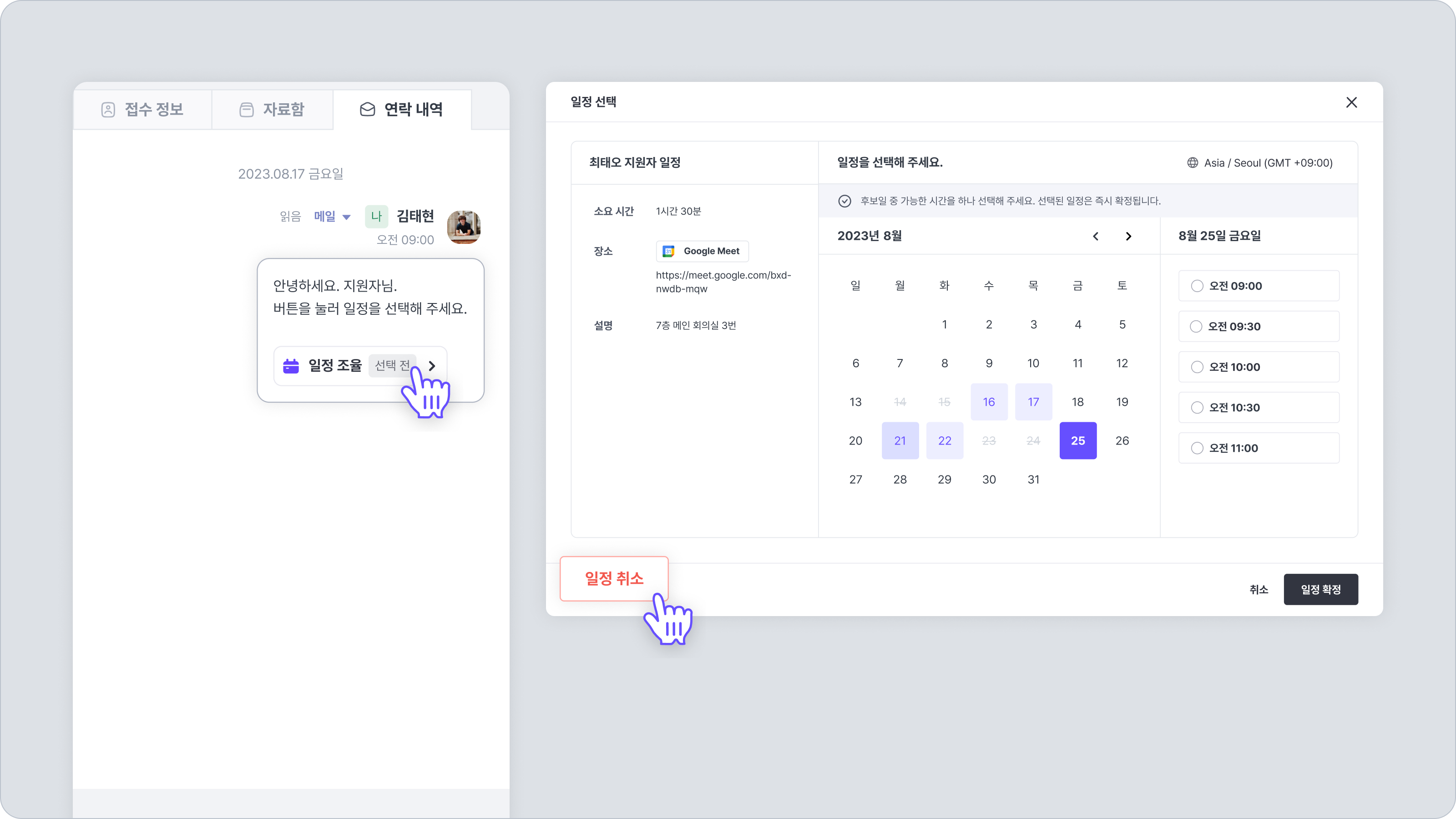 지원자가 일정을 선택하지 않은 상태(선택 전)에도 채용 담당자가 지원자 대신 일정을 확정할 수 있습니다.
