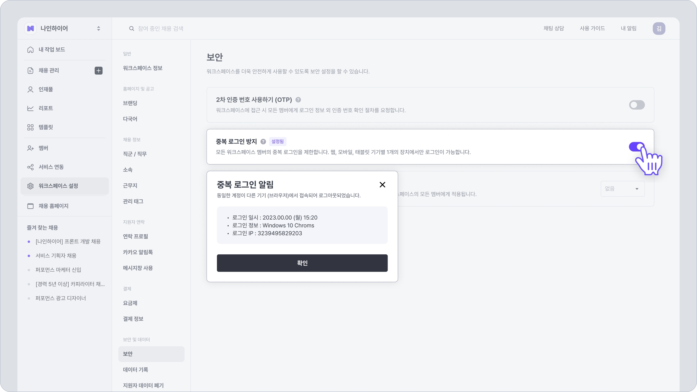 이 설정은 개인 별 설정이 아니며, 워크스페이스 내 모든 사용자에게 적용되는 설정입니다. 이 점을 유의하여 설정해 주십시오.