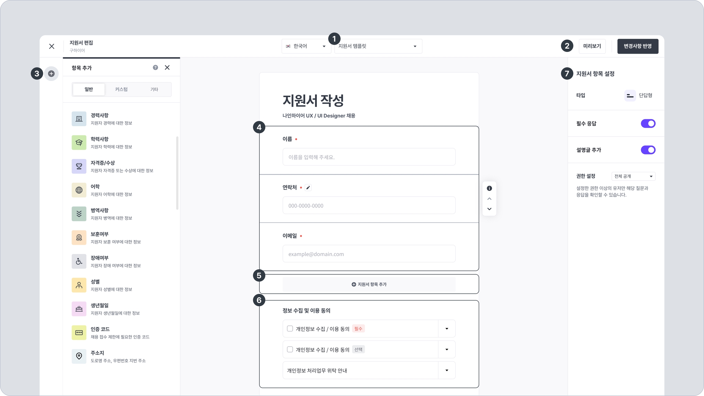 ④ 지원서 항목 설정 (필수 응답 여부, 설명글 추가, 열람 권한 설정)