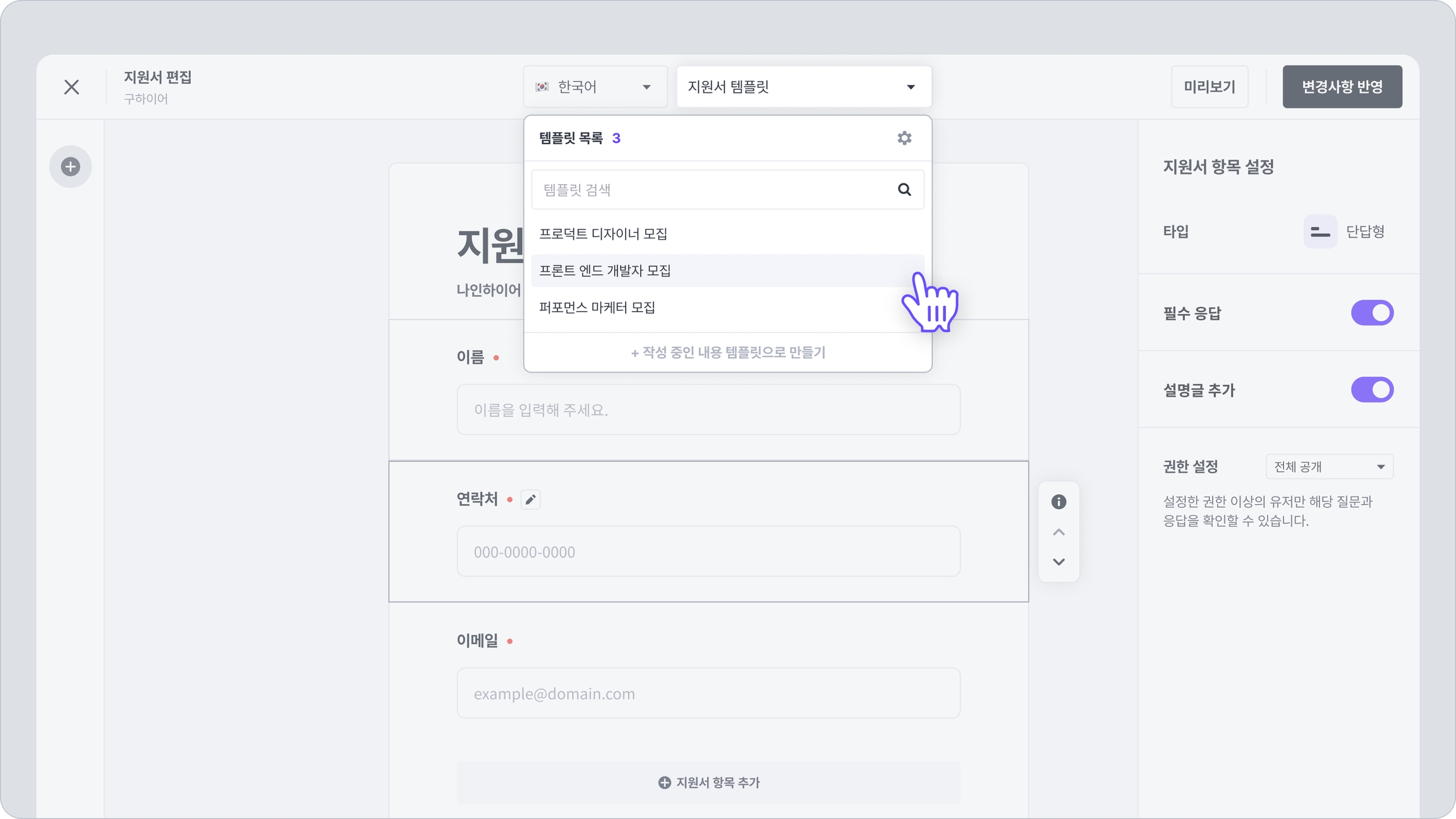 새 지원서 템플릿 창에서 지원서 템플릿을 만듭니다.