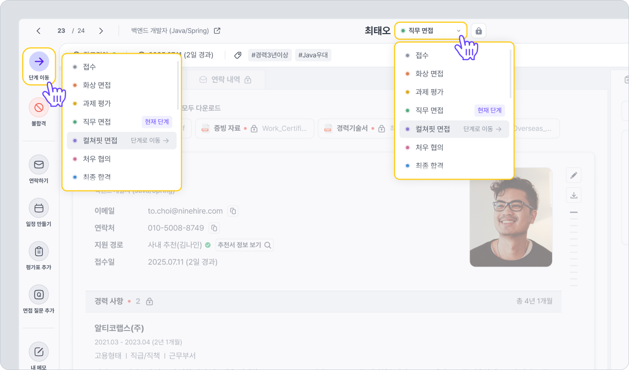 지원자 카드를 드래그해서 놓는 방식으로 지원자 단계를 이동시킬 수 있습니다.