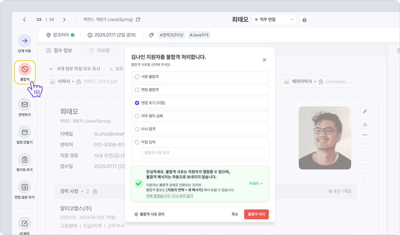지원자 상세 화면에서 지원자를 불합격 처리합니다. 불합격 처리 시에는 불합격 사유를 선택하게 됩니다. 불합격 사유는 불합격 사유 관리 페이지에서 수정할 수 있습니다.