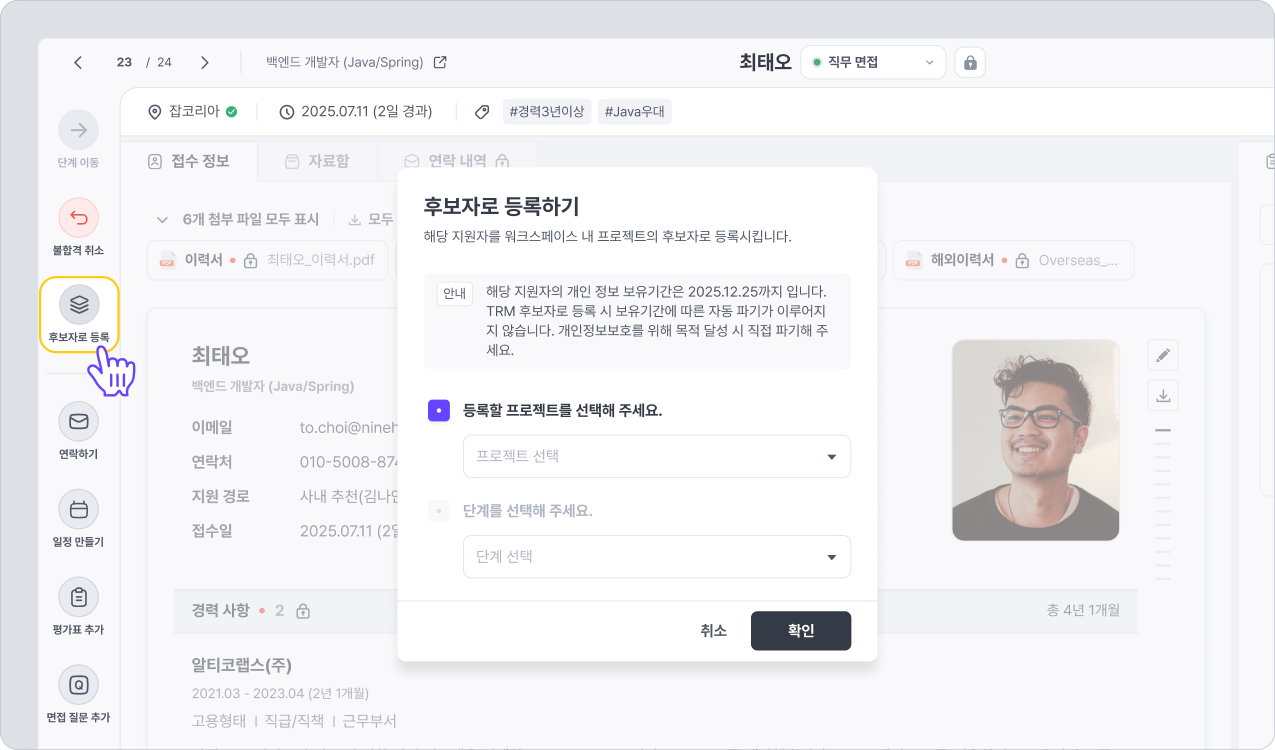 지원자를 불합격 처리하면, 아래에 [후보자로 등록] 버튼이 활성화됩니다. 놓치기 아까운 지원자를 TRM 후보자 리스트에 추가하여 장기적인 인재풀을 강화하고, 미래의 채용에 대비하세요.