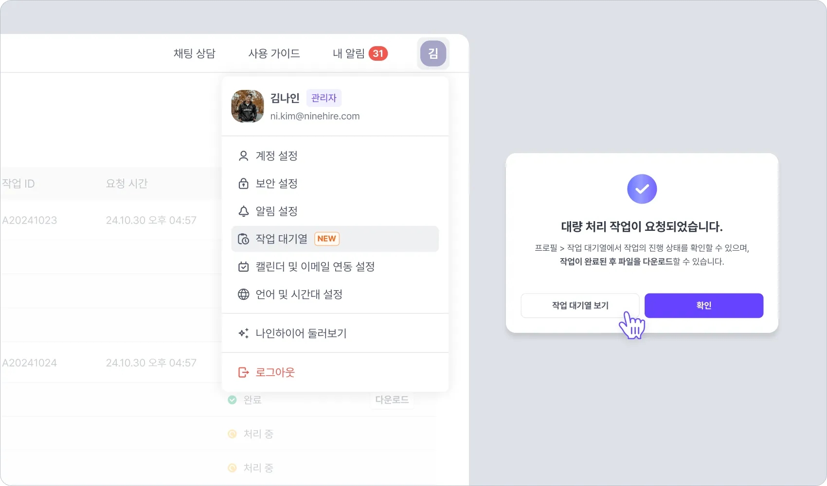 작업 대기열을 통해 대용량 파일의 생성과 다운로드를 안정적으로 지원하고 있습니다. 업데이트 템플릿의 경우 한번에 많은 수의 지원자에 대한 데이터를 생성하여야 하므로 작업 대기열을 통해 작업을 진행합니다.