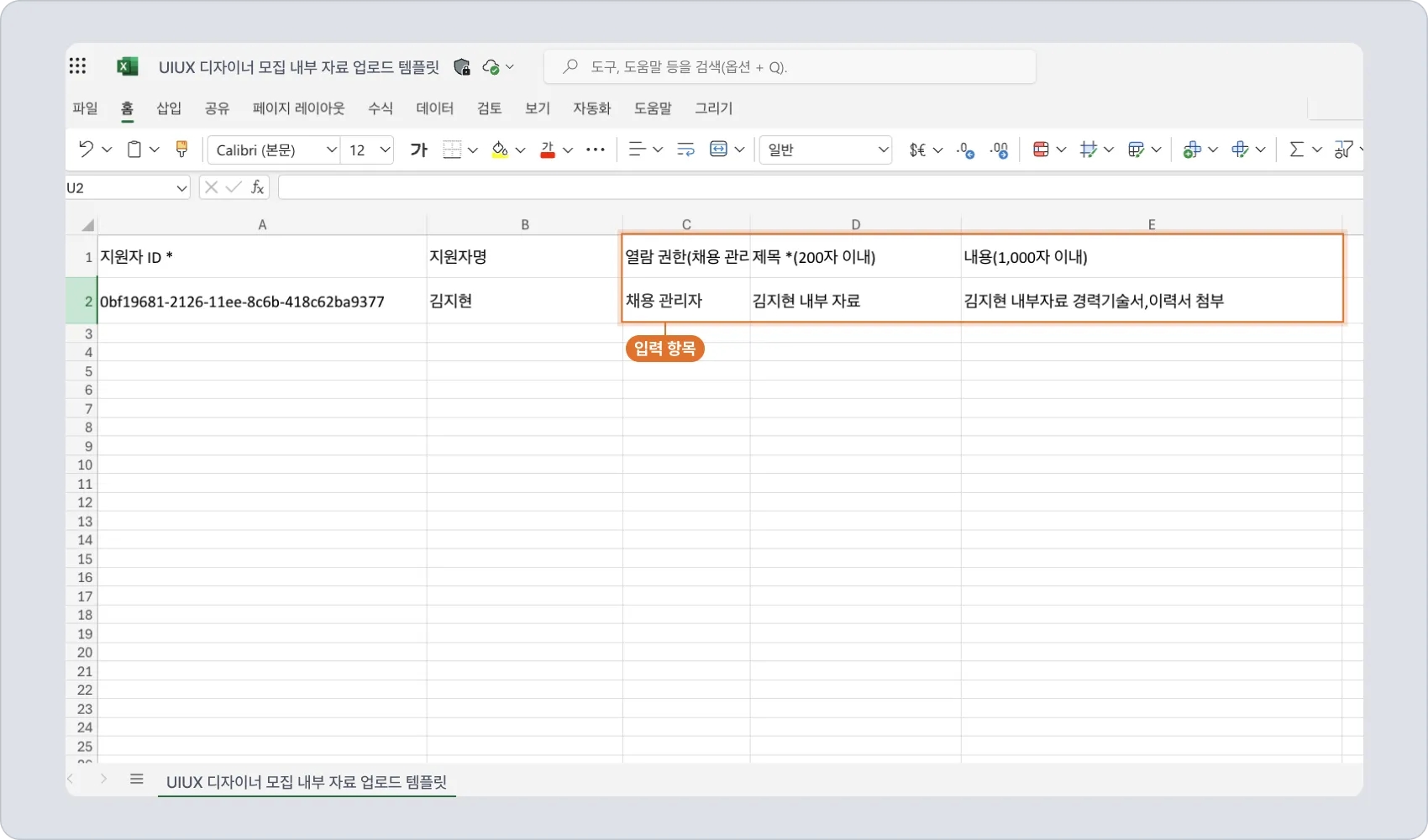 임의의 컬럼(열)을 더 추가/삭제하면 업로드 시도 시 에러가 발생합니다. 고정된 열 구성이므로 임의로 열을 추가/제거하지 마십시오.