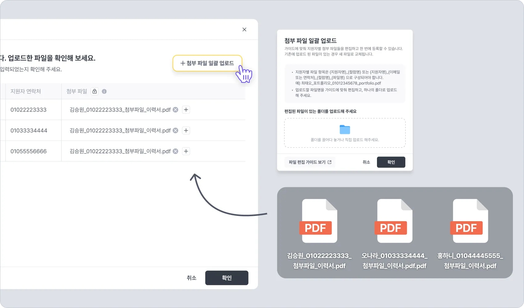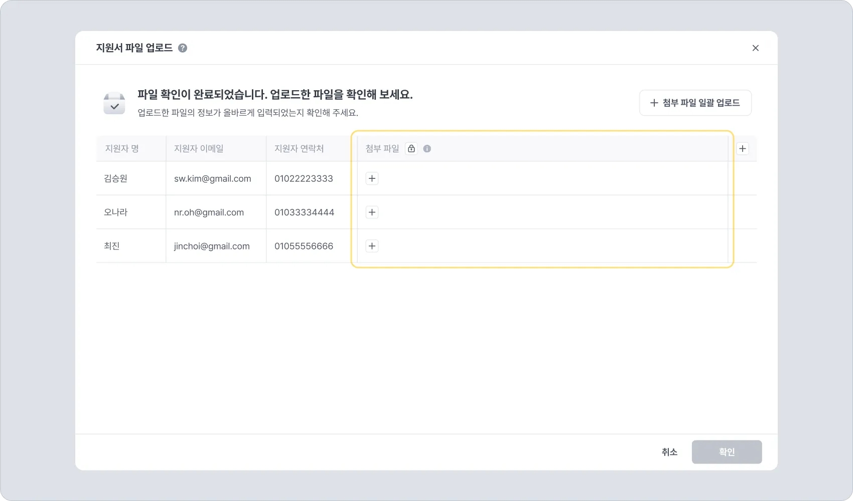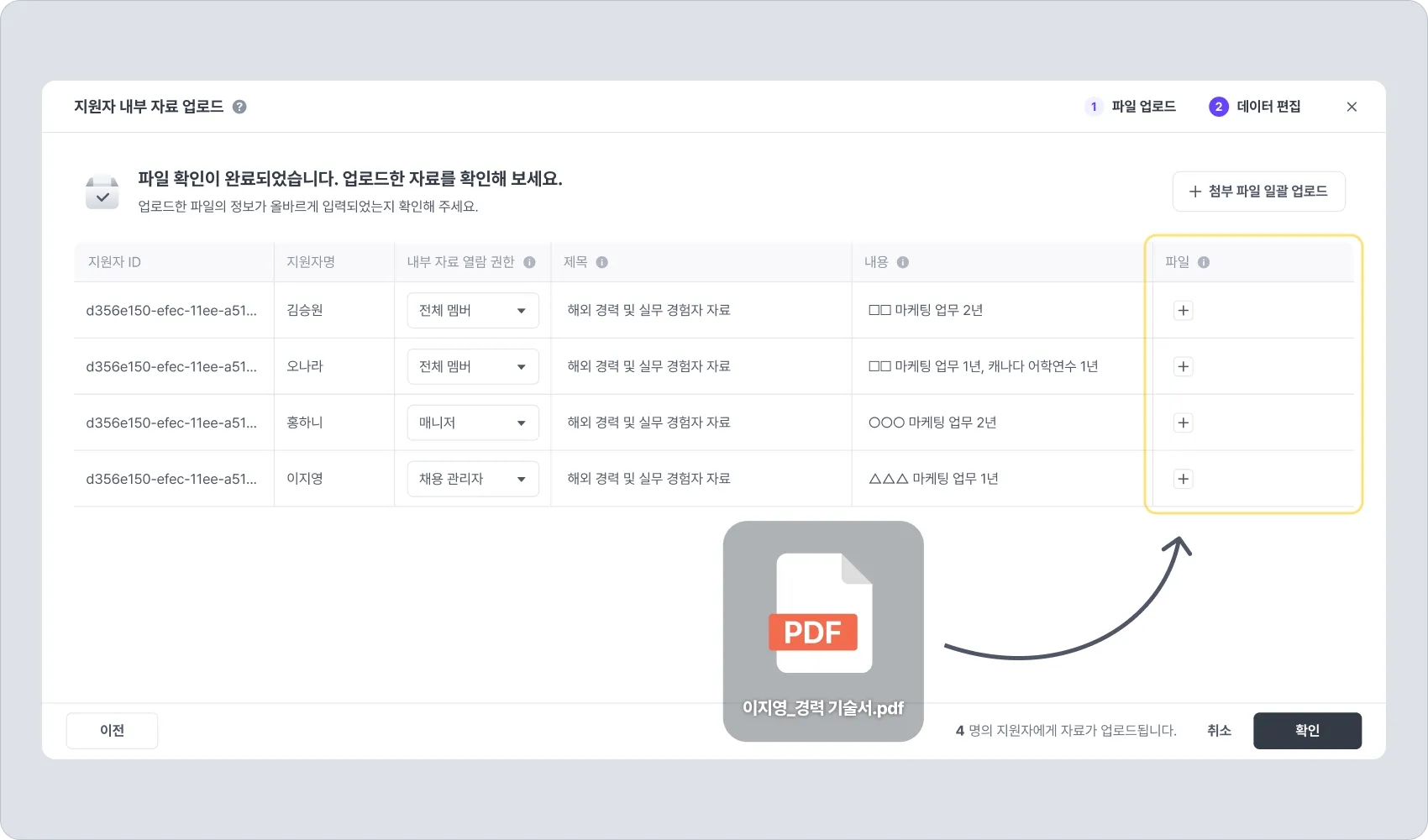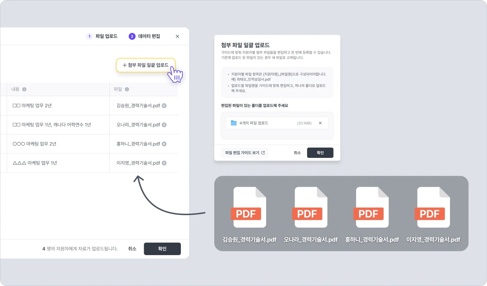 [+ 첨부 파일 일괄 업로드] 버튼을 클릭하면, 준비된 파일들을 한꺼번에 각 지원자 정보로 업로드할 수 있습니다.