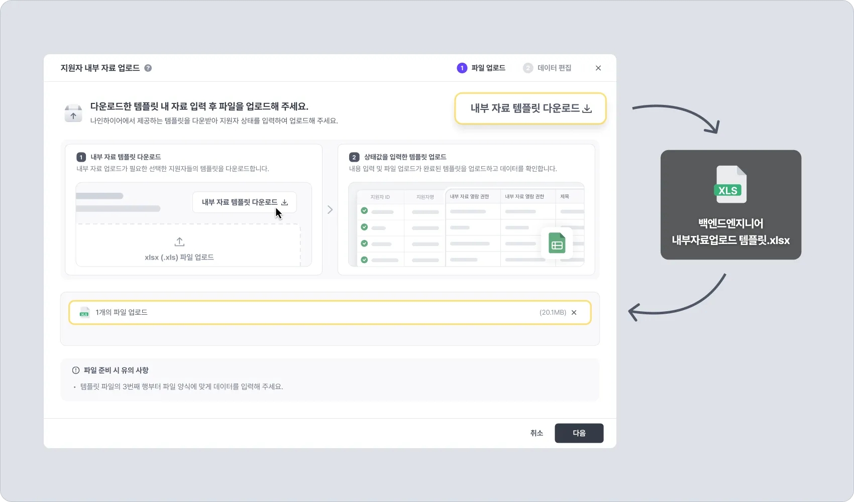 앞서 작성한 내부 자료 엑셀 파일을 “파일 업로드” 부분에 추가합니다.