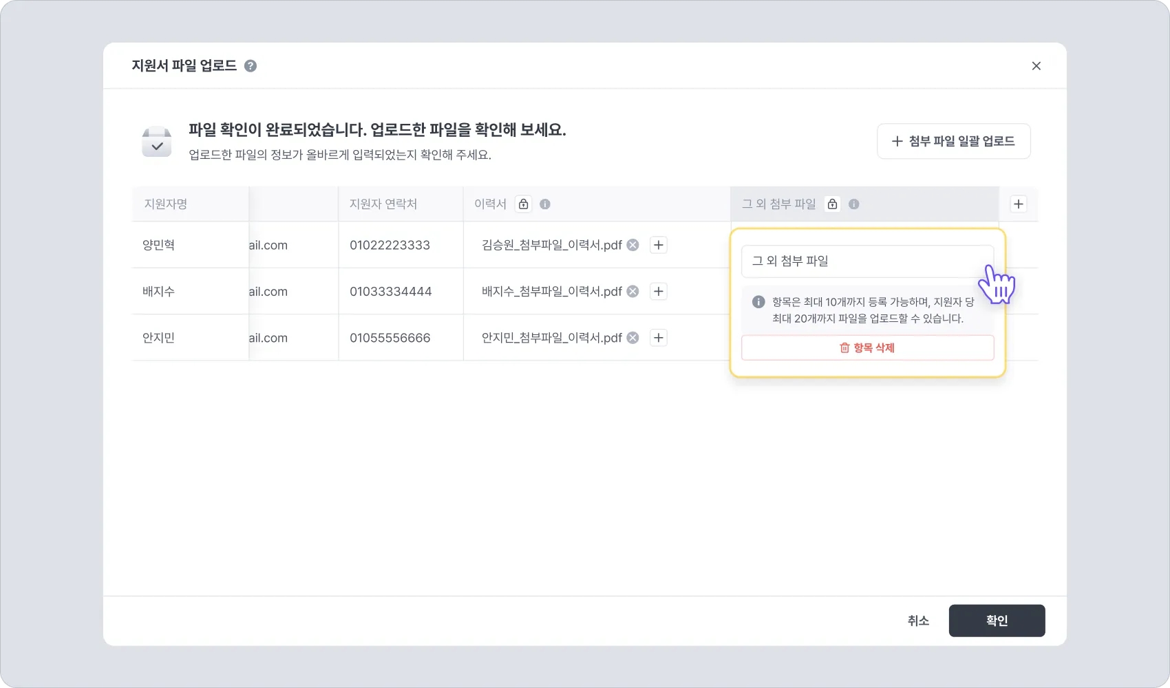 다중 선택한 지원자의 지원서 항목에 추가할 파일을 일괄로 업로드할 수 있는 기능입니다.