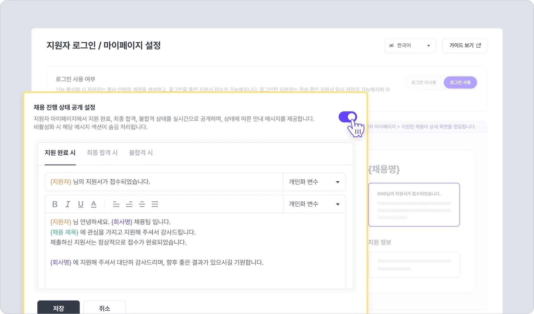 지원자가 마이페이지에 접속했을 때 지원한 채용의 진행 상태를 지원자에게 공개할 지 여부를 설정합니다.