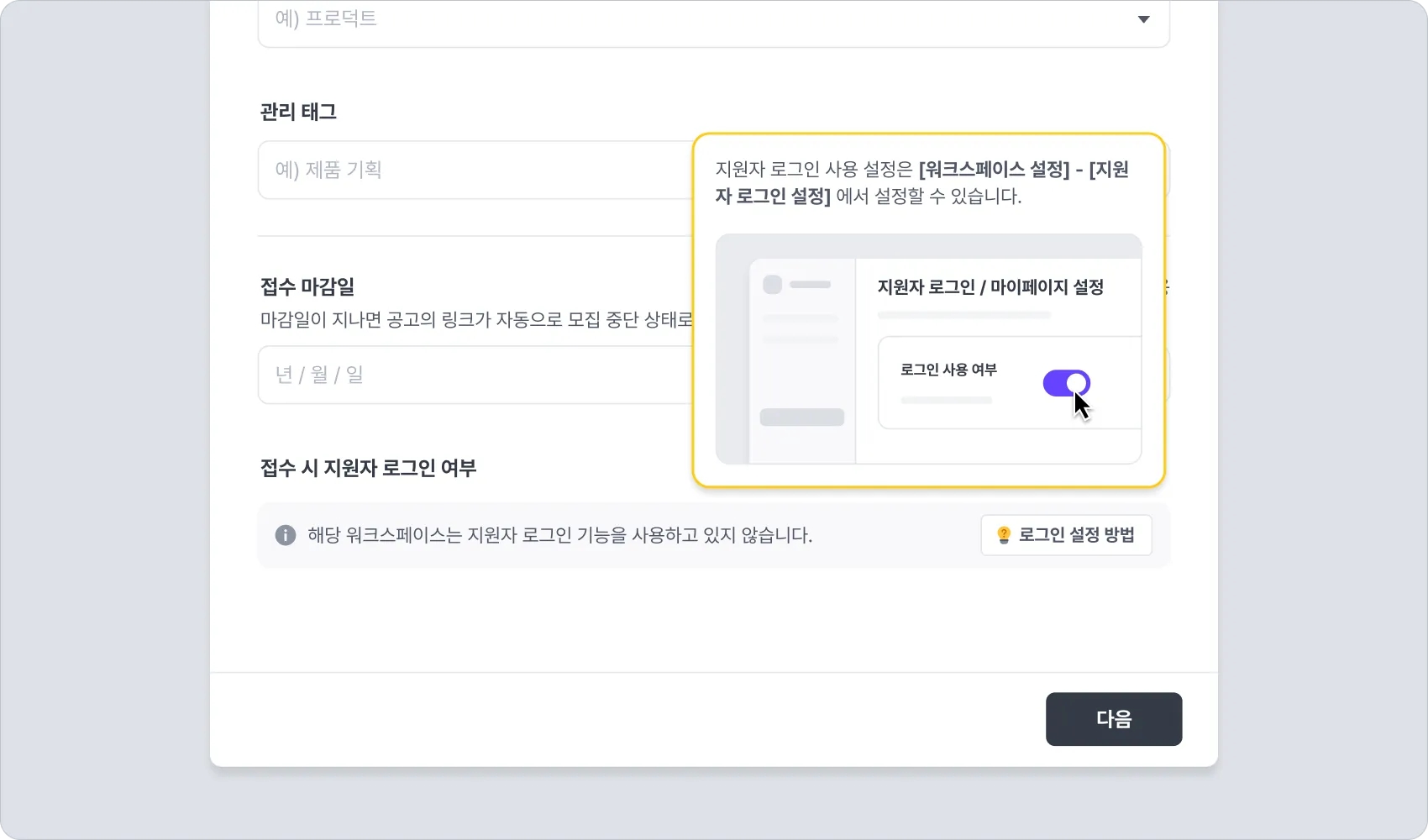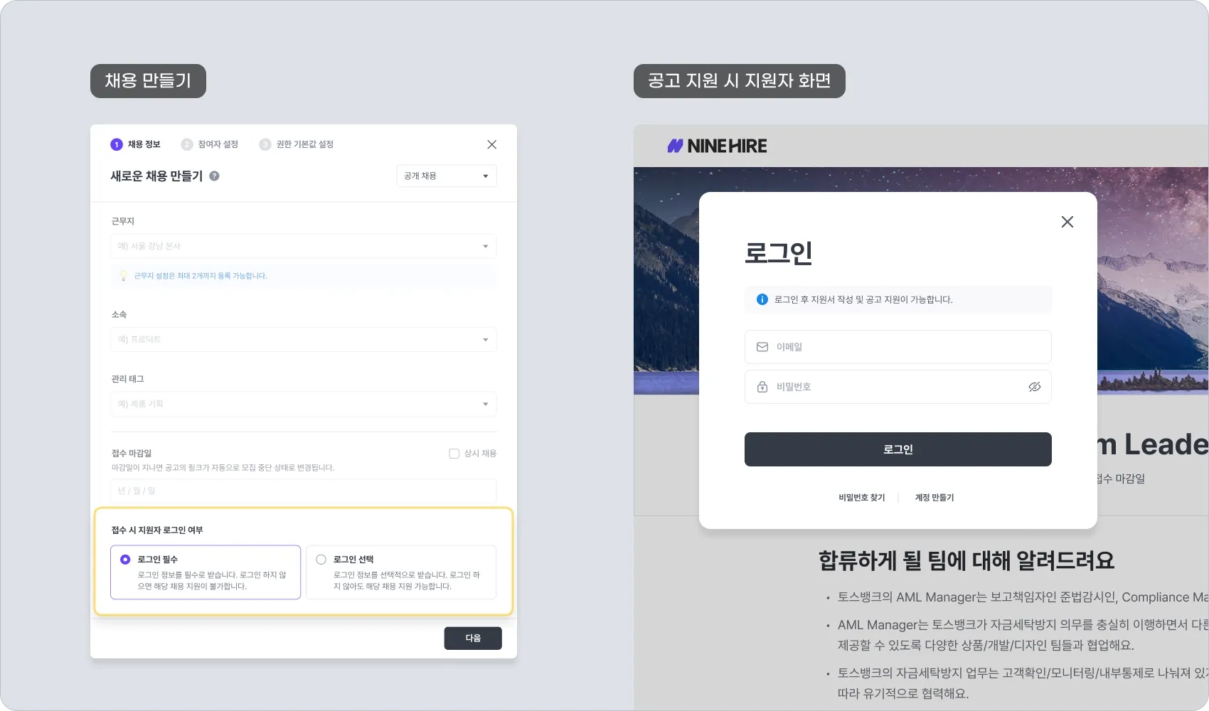 새로운 채용을 만들 때 채용 정보에서 로그인 여부를 설정하는 옵션이 추가됩니다.