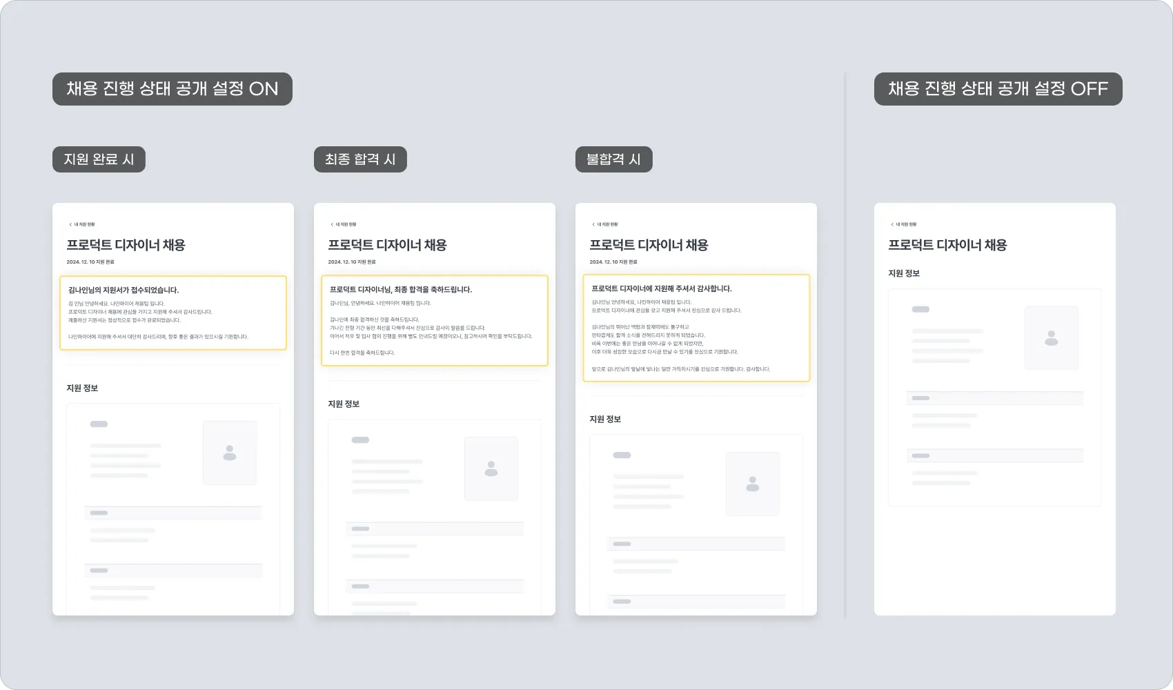채용 진행 상태 공개 설정을 OFF로 설정하면 지원자가 마이페이지 접속 시 지원서의 정보만 표시되며, 채용의 진행 상태를 확인할 수 없습니다.