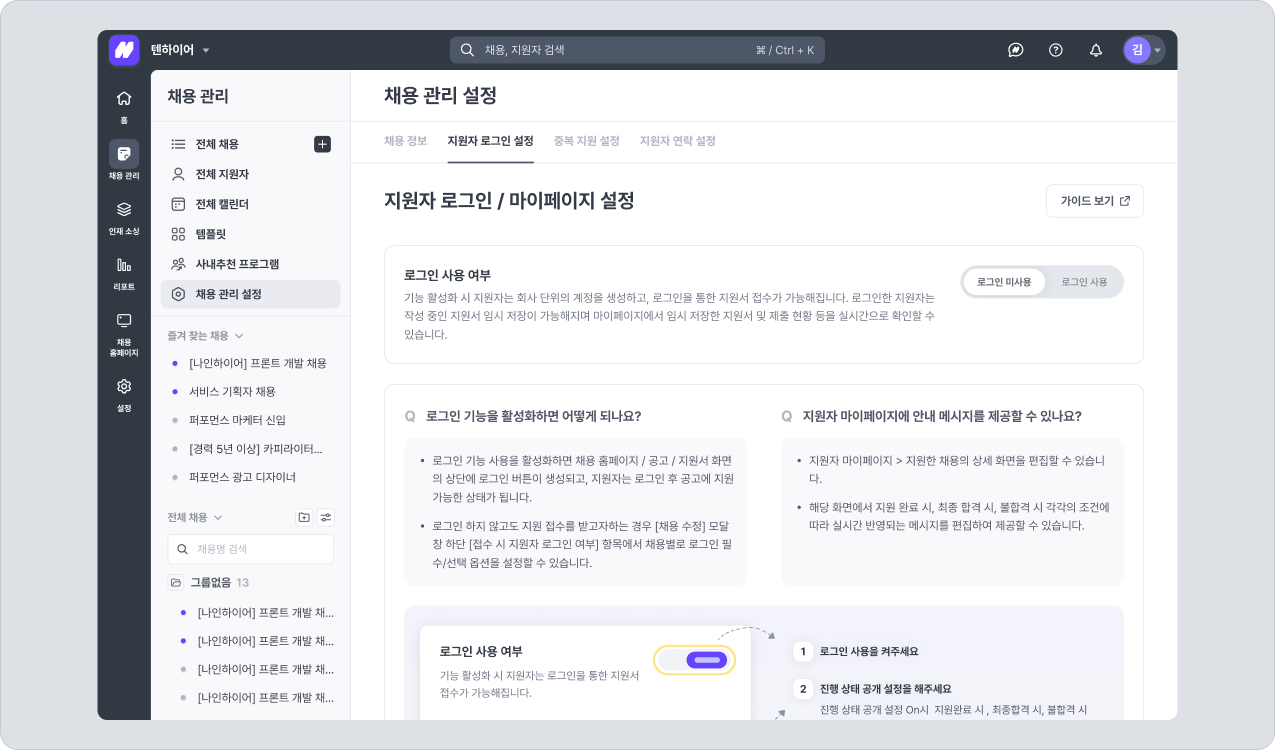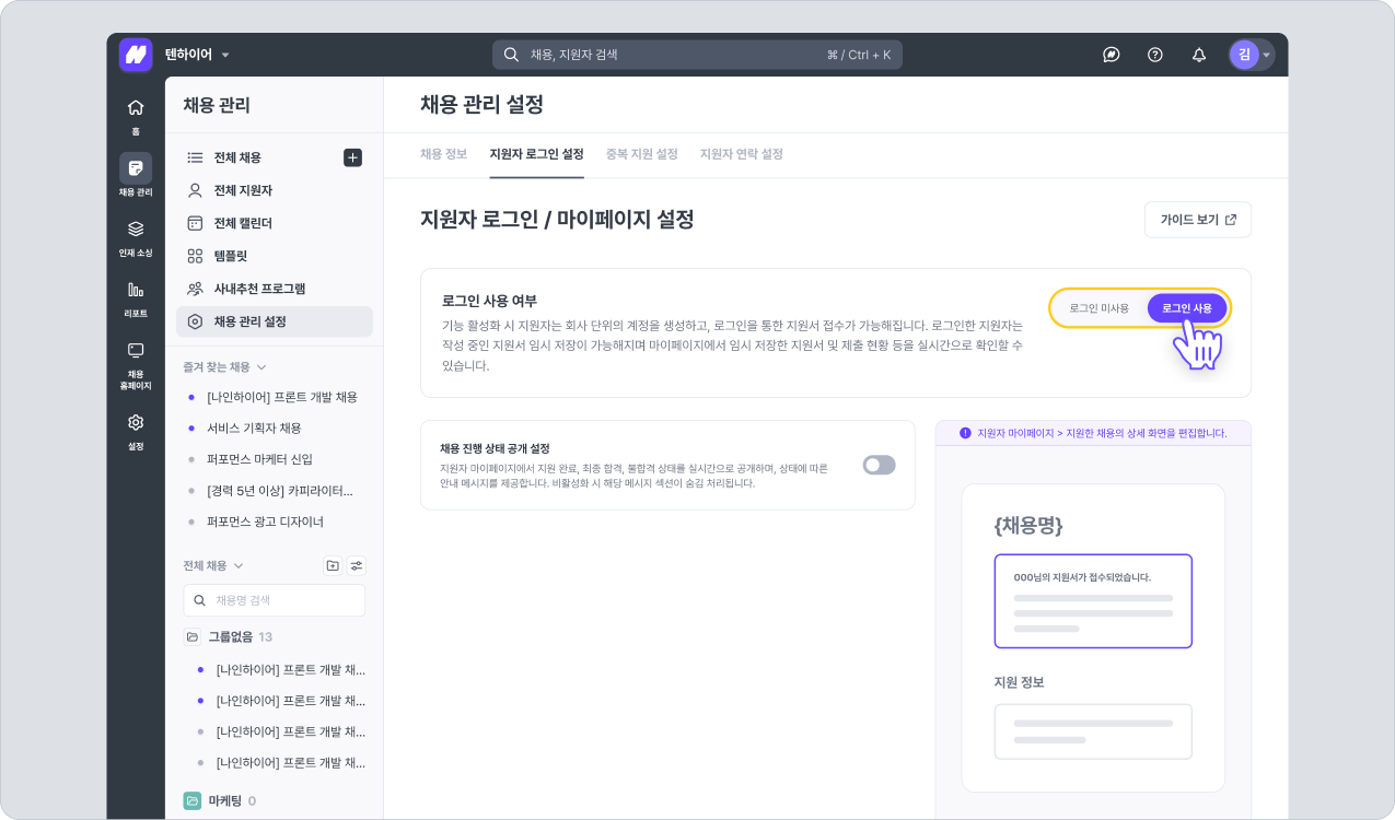 채용 관리 > 채용 관리 설정 > 지원자 로그인 설정에서 지원자 로그인 사용 여부를 설정할 수 있습니다.