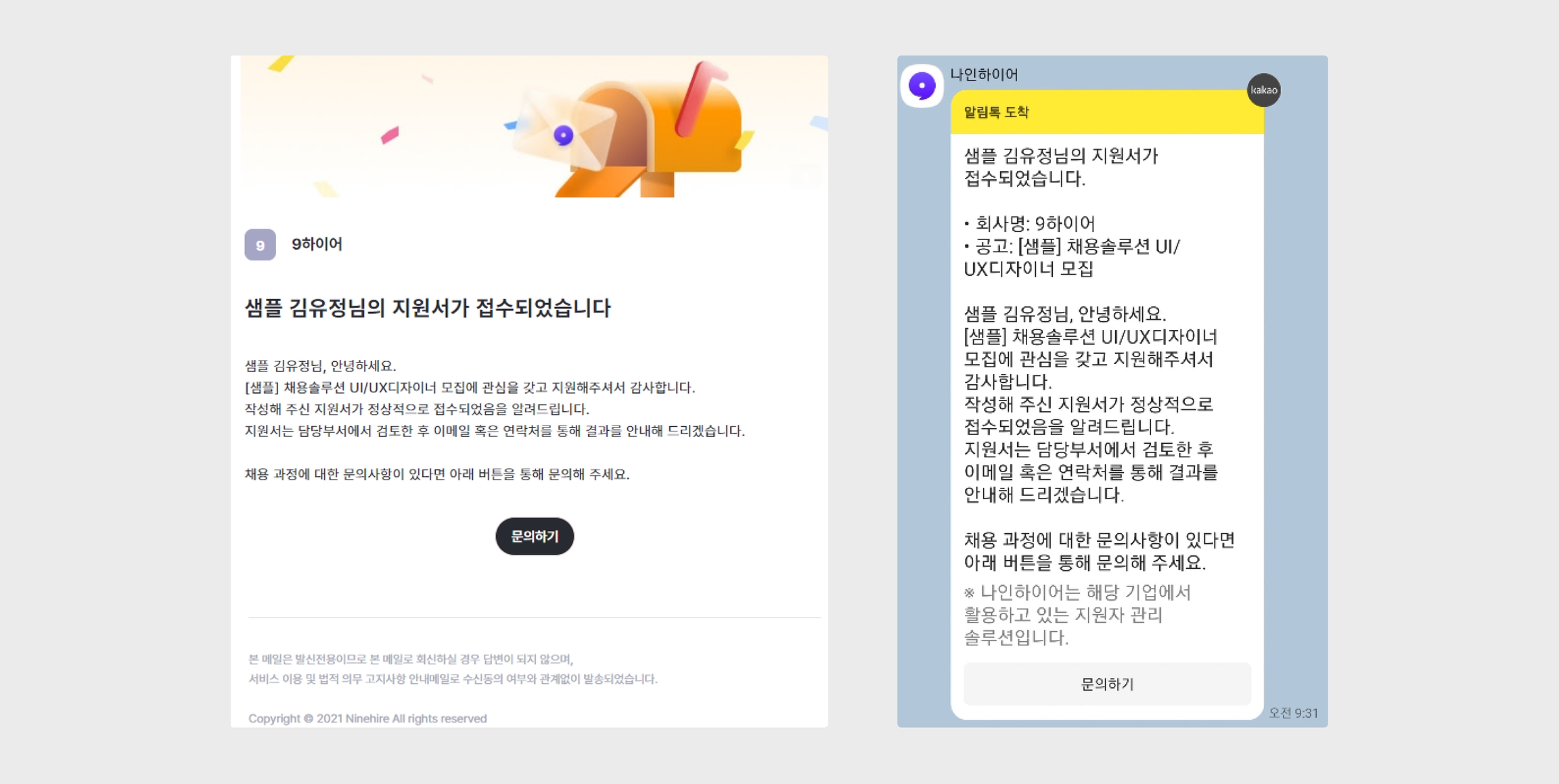 접수 안내 메일은 지원자가 직접 접수한 경우에만 발송되며, 채용 담당자가 지원자의 정보를 직접 추가한 경우 또는 나인하이어 어시스턴트로 등록된 경우에는 발송되지 않습니다.