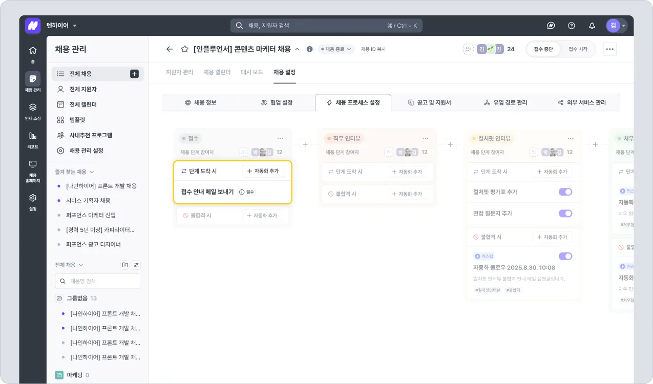 접수 안내 메일은 채용절차법 제7조 2항에 근거하여 지원자가 접수한 즉시 접수 완료에 대한 안내를 보내기 위한 자동화 액션입니다. 따라서 해당 액션은 별도로 끄실 수 없으며, 내용은 수정하실 수 있습니다.