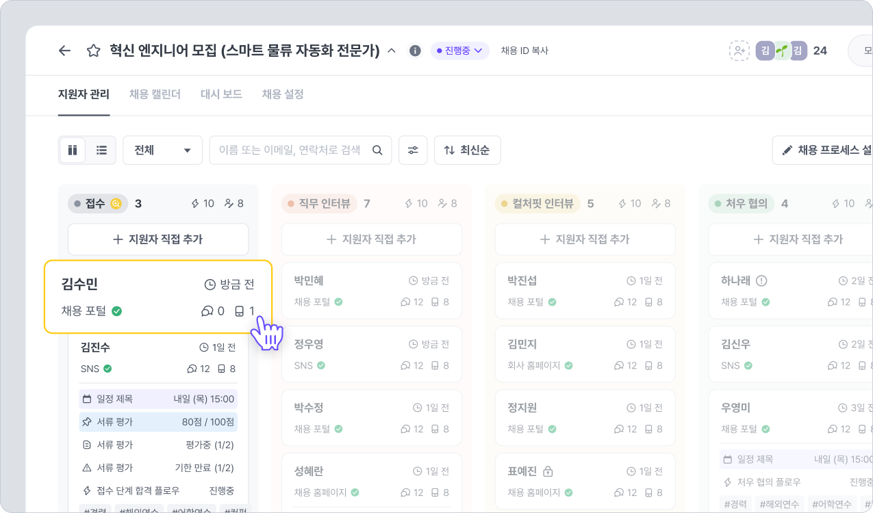 해당 채용의 접수 단계에 지원자 카드가 새롭게 등록되었습니다.