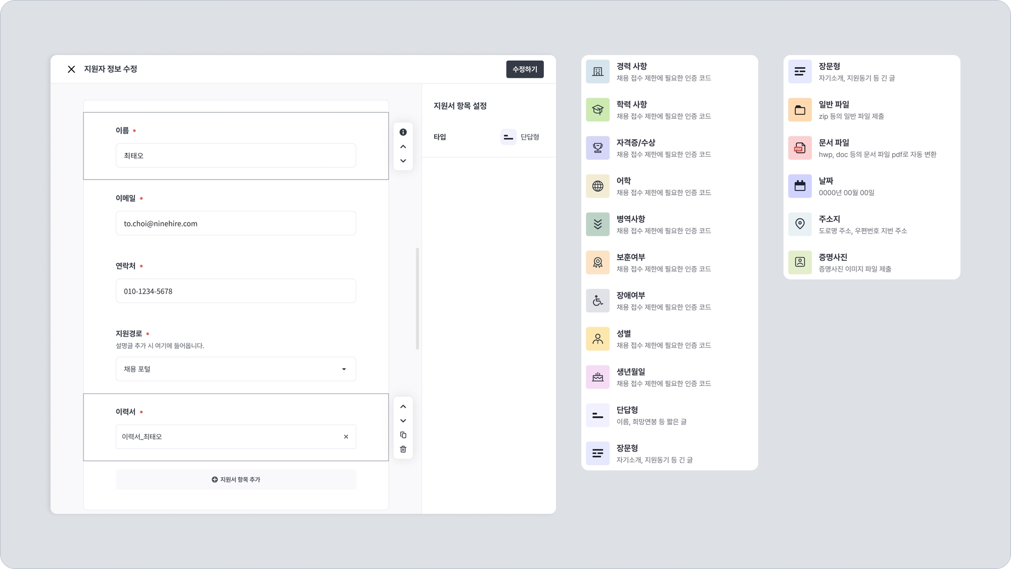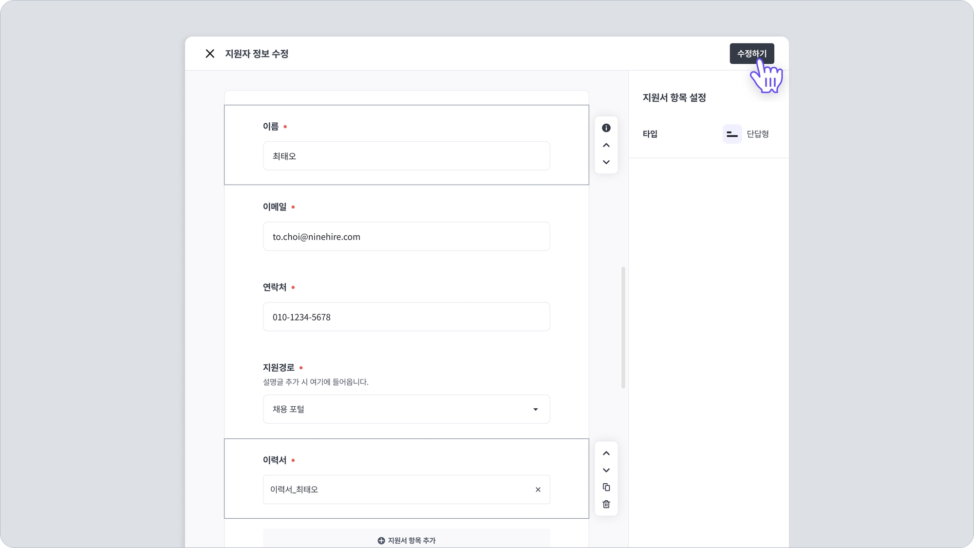 지원자 정보 수정 창이 나타납니다. 지원자가 제출한 지원서의 각 항목을 수정할 수 있습니다. 각 항목은 클릭하면 내용 수정, 이동, 복제 혹은 삭제가 가능하며, 설정 값을 변경할 수 있습니다.