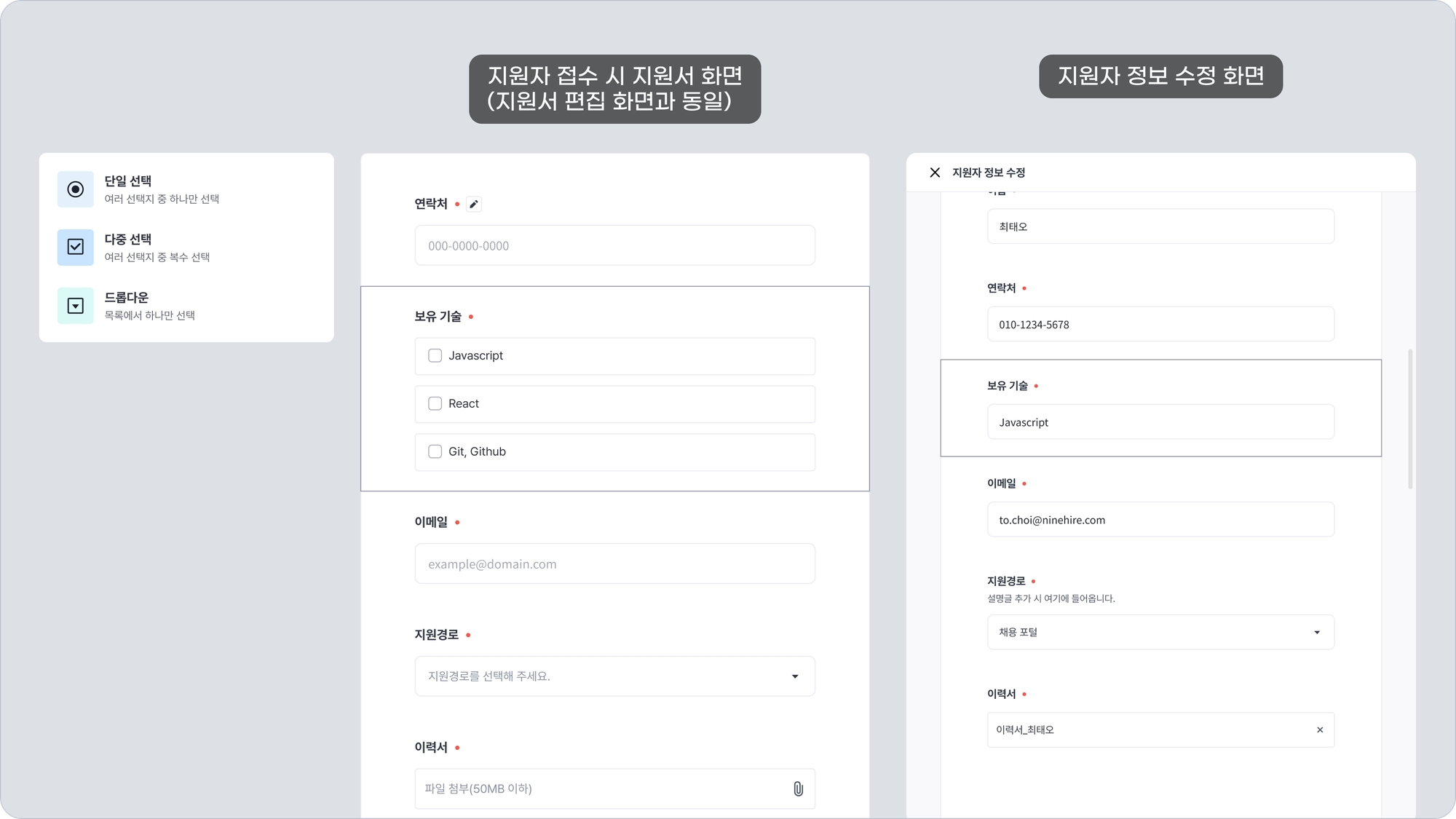 지원서 편집(혹은 지원자가 지원서 작성) 시에 선택지가 제공되는 단일 선택, 다중 선택, 드롭다운 항목은 지원자 정보 수정 시에는 단답형 항목으로 제공되며 텍스트를 직접 입력해야 합니다. 즉, 선택지가 제공되지 않습니다.