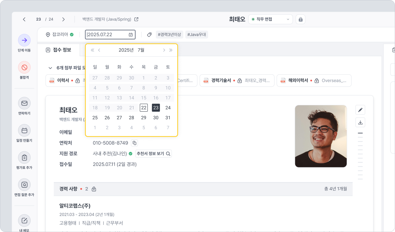 ◼ 경로: 채용 관리 → 개별 채용 → 지원자 관리 → 지원자 카드 → 상단 서브 헤더 → 접수일 클릭