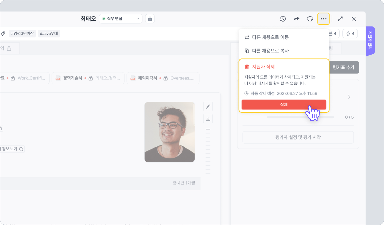 설정한 보유 기간은 지원자가 지원서를 제출한 시점(접수일)을 기준으로 계산됩니다. 각 지원자의 보유 기간(삭제 예정 일시)은 지원자 상세 화면 오른쪽 상단 [...] 더보기 버튼을 클릭한 후 [지원자 삭제]를 한 차례 누르면 확인할 수 있습니다. (빨간색 삭제 버튼을 클릭하면 지원자가 완전히 삭제되므로 주의해주세요.)