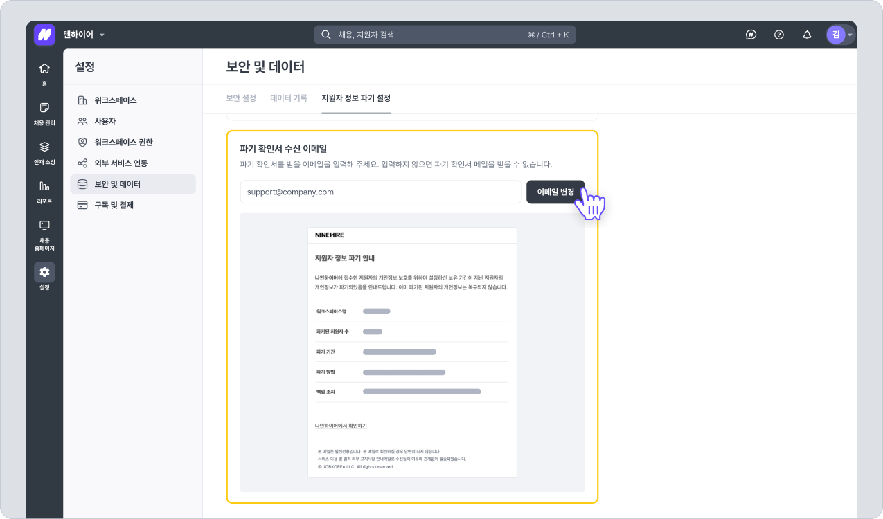 워크스페이스 관리자는 관련 법령 및 내부 정책에 따라 지원자 정보의 보유 기간을 설정하고, 보유 기간이 종료된 지원자 정보를 자동으로 파기하도록 관리할 수 있습니다.
