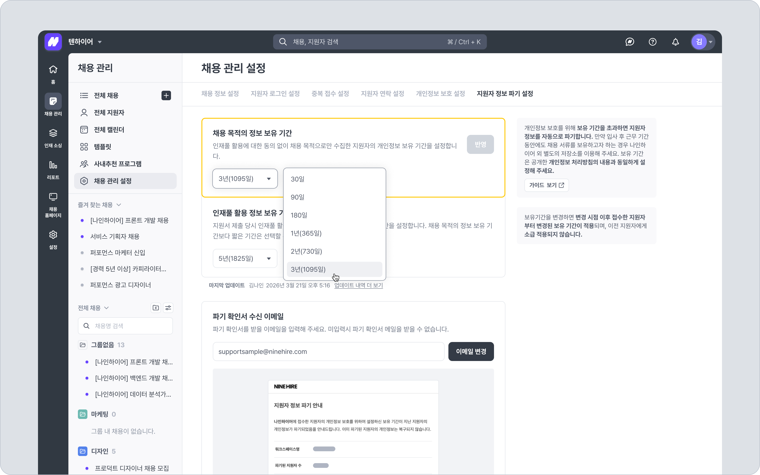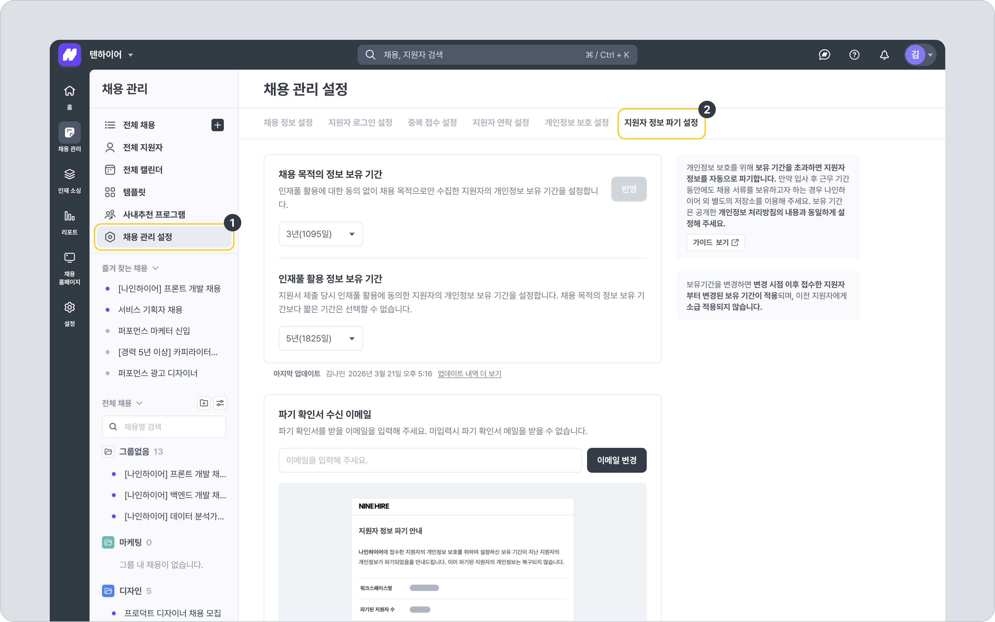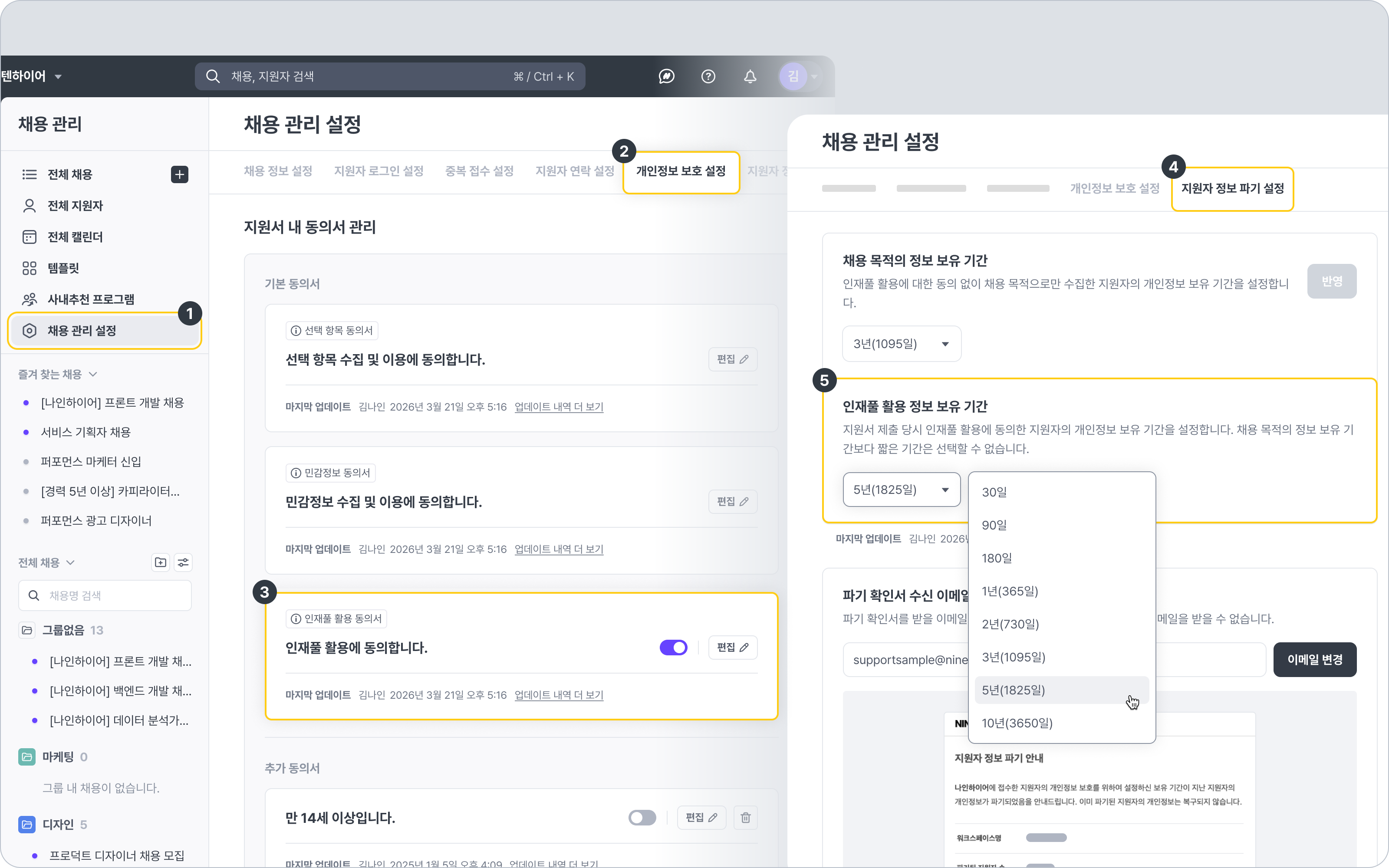 본 기능은 채용 과정에서 수집된 지원자 개인정보의 보유(보관) 기간과 파기 시점을 설정하는 기능입니다.